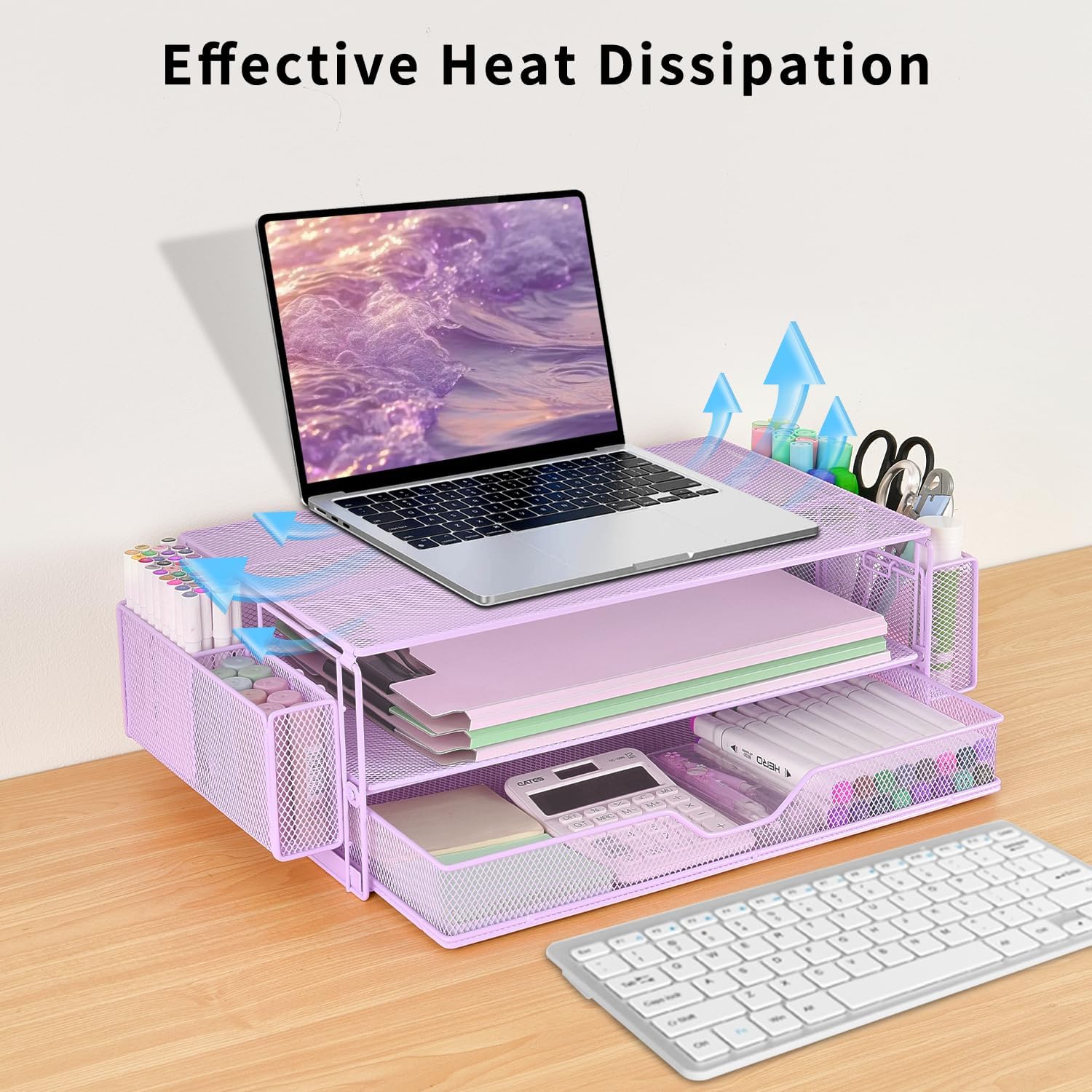 - Space Saving: Our dual-tier desktop organizer with drawer and 2 pen holders stores office supplies and office desk accessories neatly. As a purpose monitor riser, it keeps your workspace organized, helping you focus and work efficiently