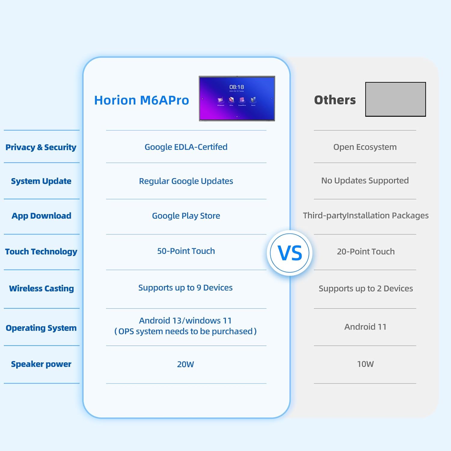 - 【Android 13 & Google Play】: The smooth animation engine and multitasking capabilities of Android 13 enable the whiteboard to run multiple applications simultaneously, such as teaching courseware, conference software, and real-time annotation tools, with silky-smooth operation and no lag. It provides direct access apps on Google Play, allowing one-click download of adapted interactive teaching apps (such as Nearpod and Kahoot!) and conference collaboration tools (such as Zoom and Microsoft Teams), which can run natively without additional adaptation.
