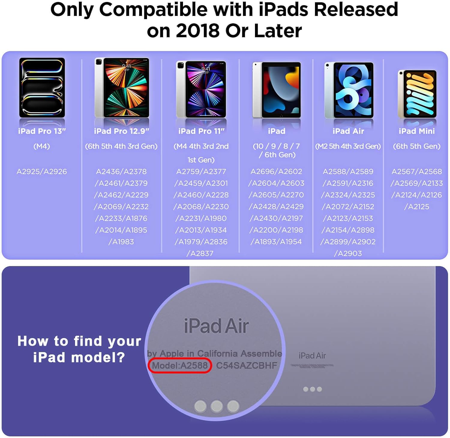 - Compatible Devices : iPad Air Series: iPad Air (2024, M2) ; iPad Air 5th - A2588/A2589/A2591; iPad Air 4th -A2316/A2324/A2325/A2072; iPad Air 3rd - A2152/A2123/A2153/A2154, iPad Pro Series: iPad Pro 11-inch (2024, M4); iPad Pro 13-inch (2024, M4); iPad Pro 11-inch (2018-2023) - A2759/A2435/A2761/A2762/ A2377/A2301/A2459/A2460 /A2228/A2068/A2230/A2231/A1980/A2013/A1934/A1979; iPad Pro 12.9-inch (2018-2023) - A2436/A2764/A2437/A2766/A2378/A2379/A2461/A2462/ A2229/A2069/A2232/A2233/A1983/A2014/A1895/A1876, iPad Series: iPad 10th (2022) - A2696/A2757/A2777; iPad 9th (2021) - A2602/A2603/A2604/A2605; iPad 8th (2020) - A2270/A2428/A2429/A2430; iPad 7th (2019) - A2197/A2200/A2198; iPad 6th (2018) - A1893/A1954;, iPad mini Series: iPad mini 6th -A2567/A2568/A2569; iPad mini 5th - A2133/A2124/A2126/A2125 iPad Air Series: iPad Air (2024, M2) ; iPad Air 5th - A2588/A2589/A2591; iPad Air 4th -A2316/A2324/A2325/A2072; iPad Air 3rd - A2152/A2123/A2153/A2154, iPad Pro Series: iPad Pro 11-inch (2024, M4); iP⌠See more