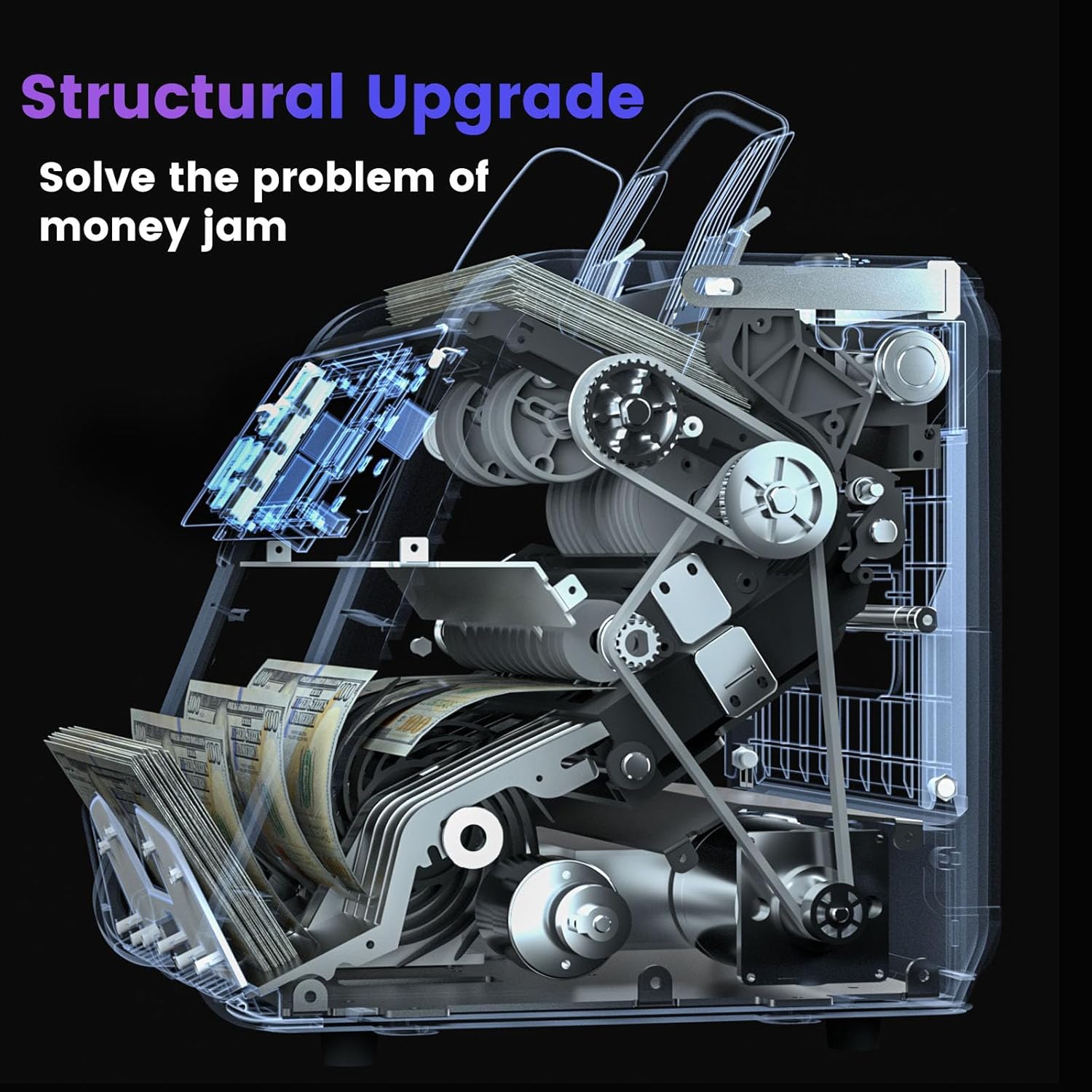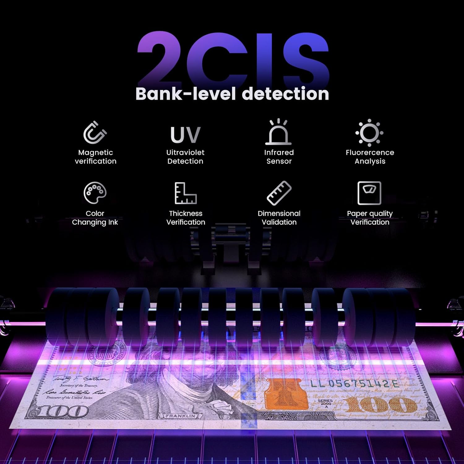 - 【Advanced 2CIS Technology】 With 2 contact image sensors and advanced detection capabilities (UV, MG, IR, NT, and SN recognition), our cash counting machine achieves BANK-LEVEL anti-counterfeiting detection.