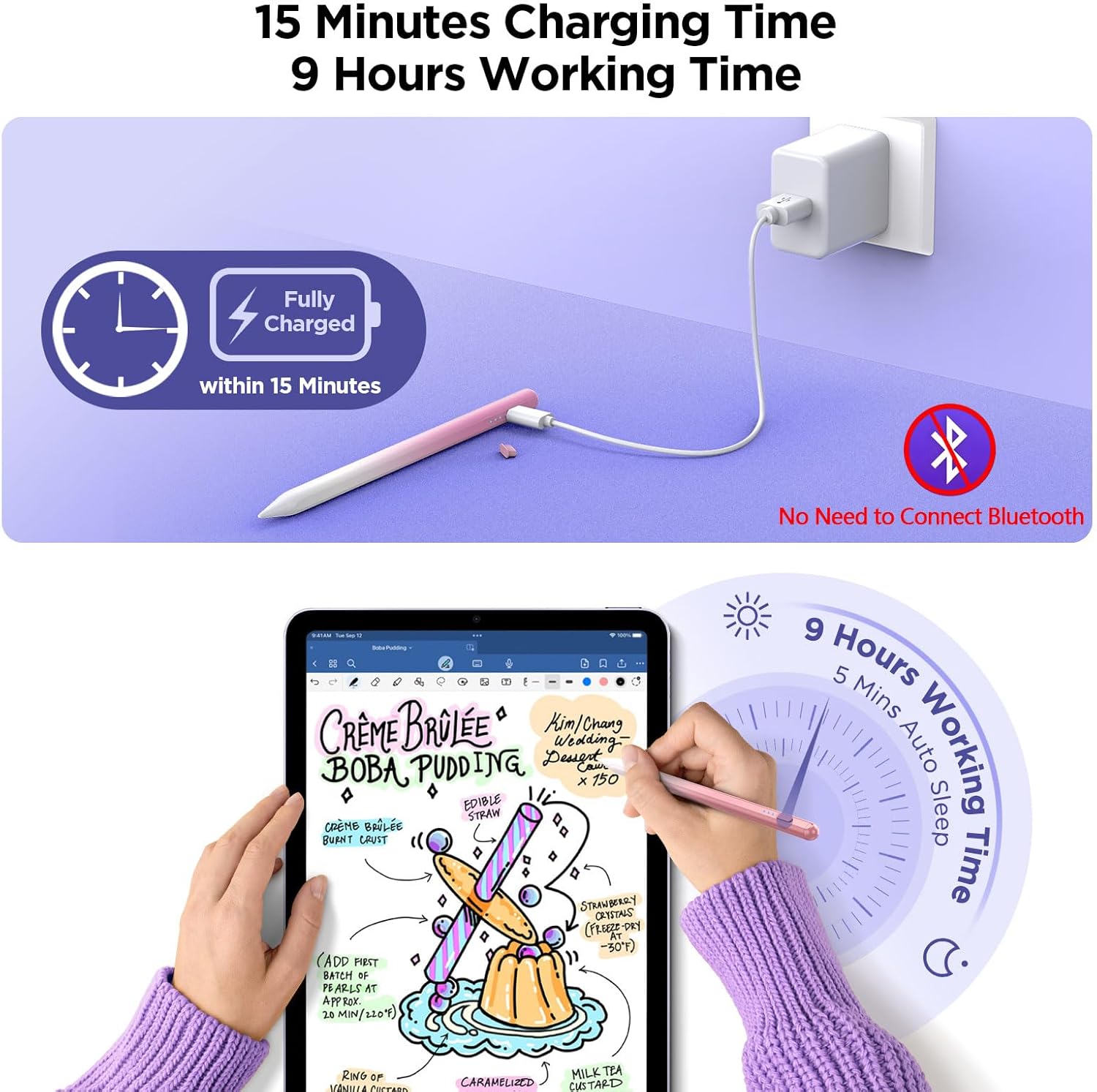 - ă15 Mins Fast Charging, 9 Hours of Useă No need to charge frequently. Experience uninterrupted creativity with our iPad pencil lightning-fast charging capabilities. 2X Faster Charging speed than others. Just 15 minutes of charging provides an impressive 9 hours of continuous usage, long lasting battery life.This ensures that your creative process is not interrupted. You can use it all day long.