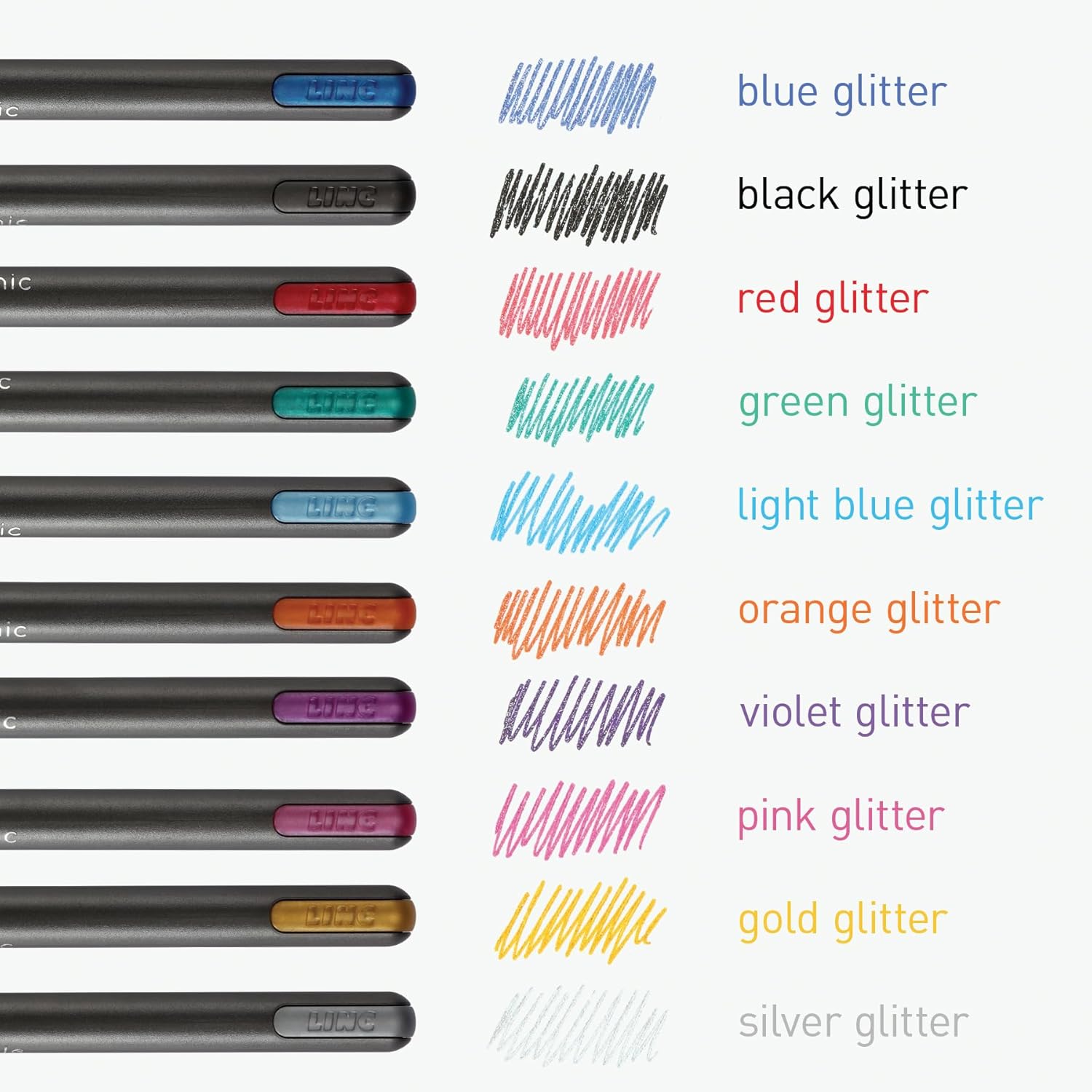 - This Pentonic multicolor glitter gel pen set comes with 10 glitter pens in 10 different colors: black, red, green, blue, light blue, orange, purple, pink, gold, silver
