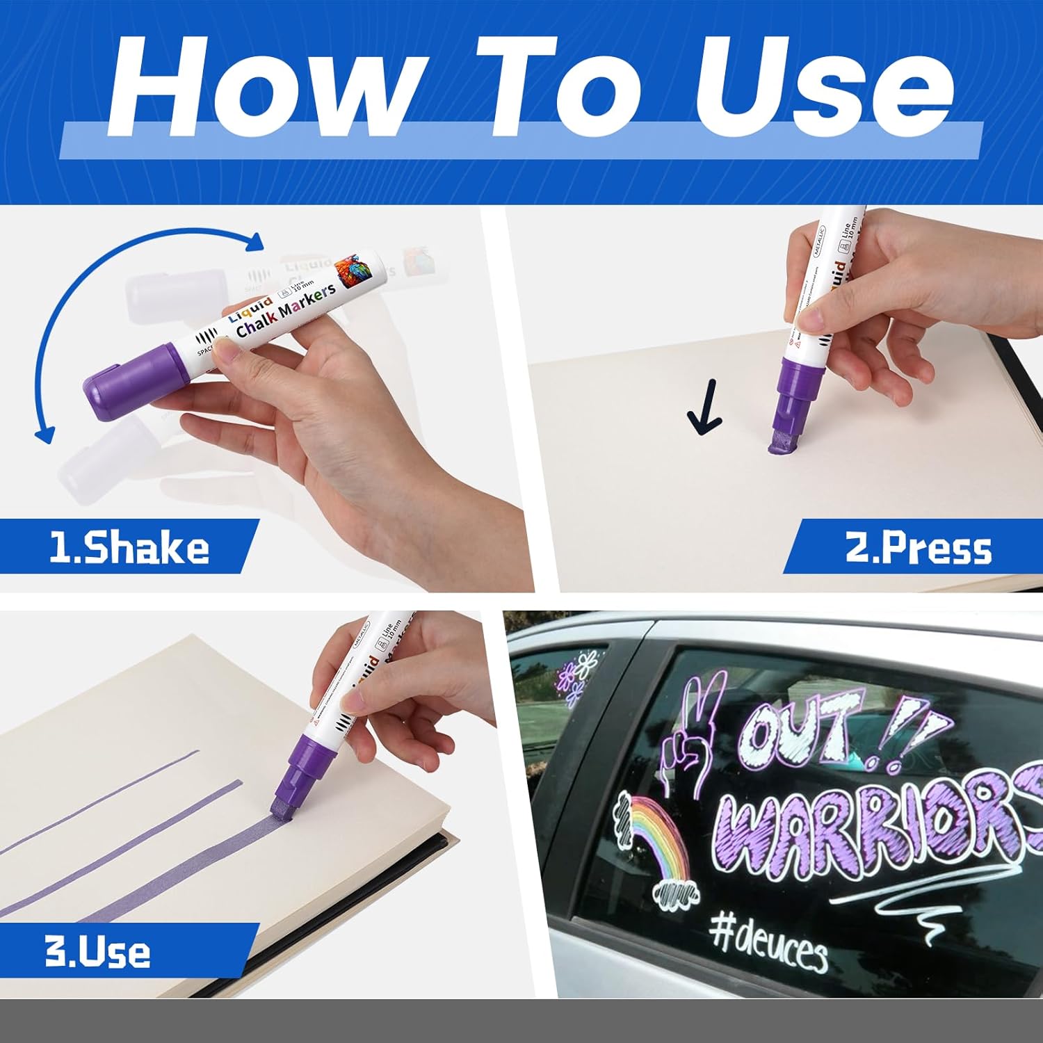 - EASY TO USE & CLEAN: Our liquid chalk markers erasable are designed for effortless application and clean-up. To use, simply put the cap back on, shake the marker thoroughly, press the tip to saturate it with ink, and test it on paper. Erasing is equally straightforward, as our dry & wet erase markers wipe clean with a dry or damp cloth, leaving no residue.