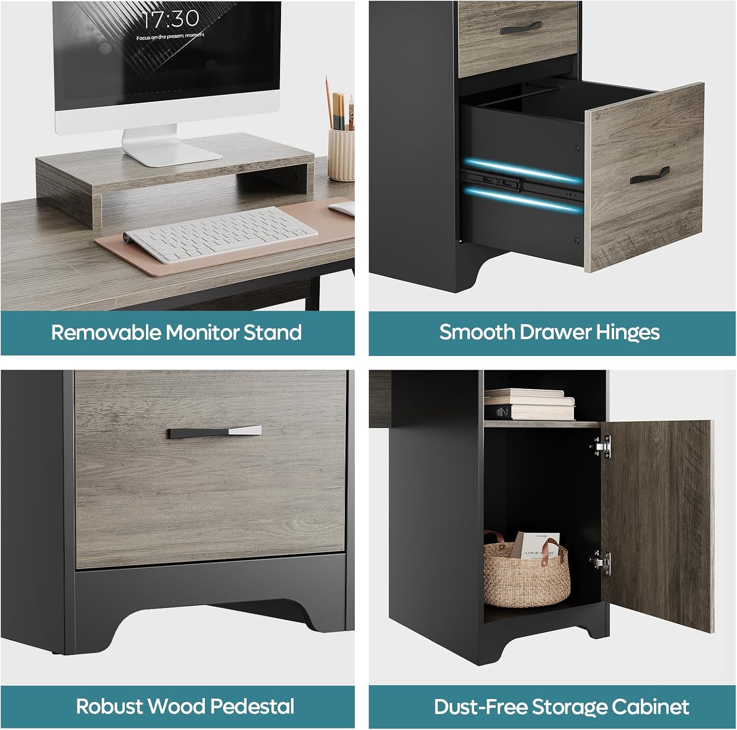 - Versatile Storage: The large desk offers a variety of storage options with 2 open storage compartments, a storage drawer, a file drawer for letter/A4/legal-size hanging file folders, and a dust-free storage cabinet, keeping your workspace organized and your essentials dust-free