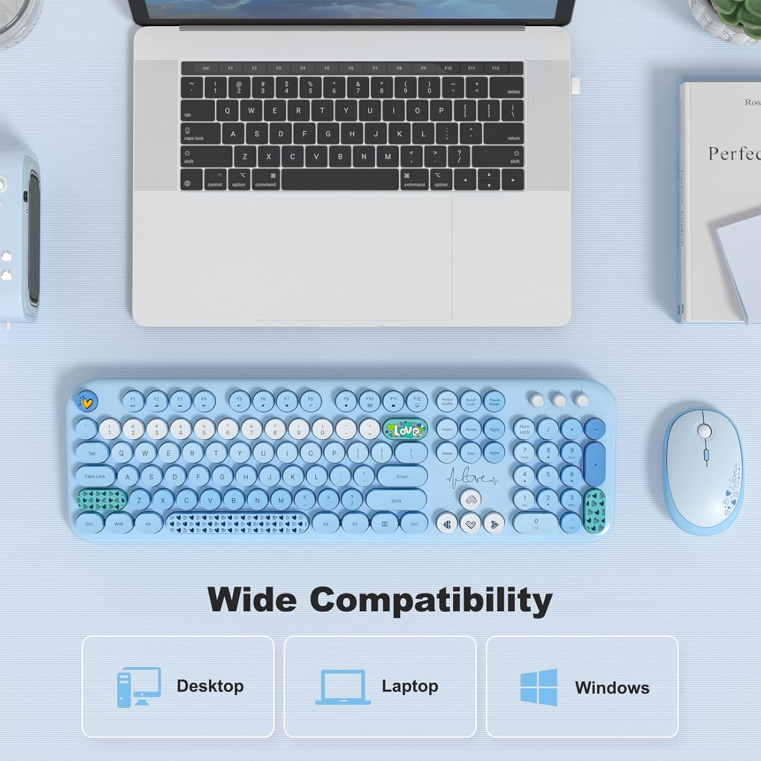 MOFII Wireless Keyboard and Mouse Combo, Cute Full Size Retro Typewriter Keyboard and Wireless Mouse, 2.4GHz Set for PC/Desktop/Laptop/Windows (Blue Colorful)
