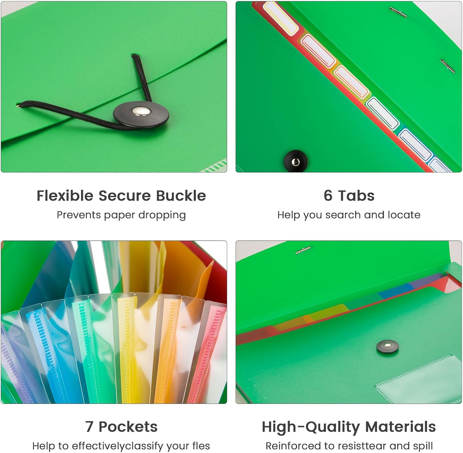 Accordion File Organizer, 7 Pockets Expanding File Folder with Labels, A4/Letter Size Portable Folders for Documents, Paper Organizer for School Office Supplies, Green