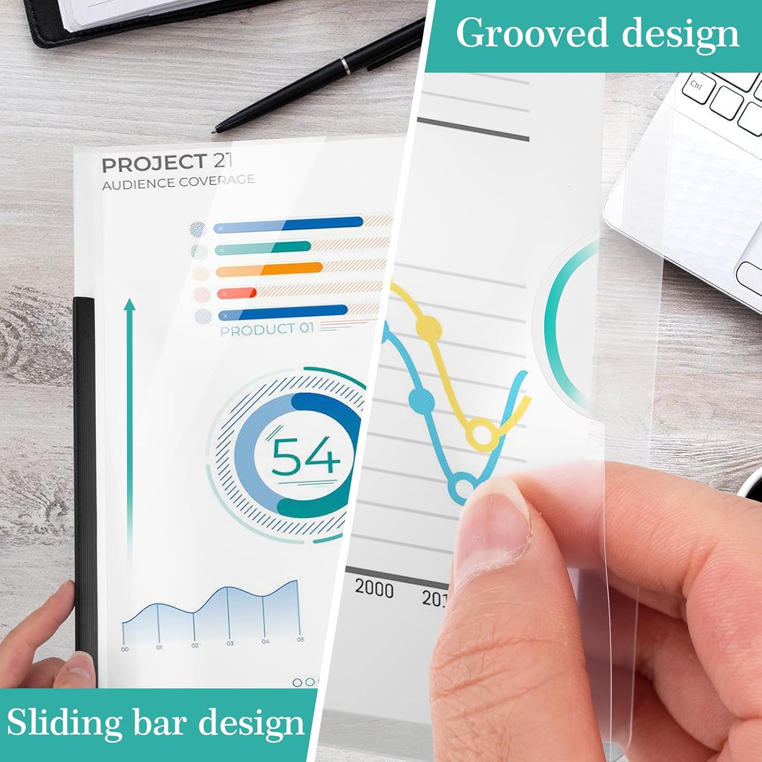 - Convenient Design: Say goodbye to traditional binders that require punching holes in your precious documents. Our plastic report covers feature a sleek slide bar design that eliminates the need for perforation, preserving the integrity of your pages.. And the semi-circular opening on the cover enhances document retrieval
