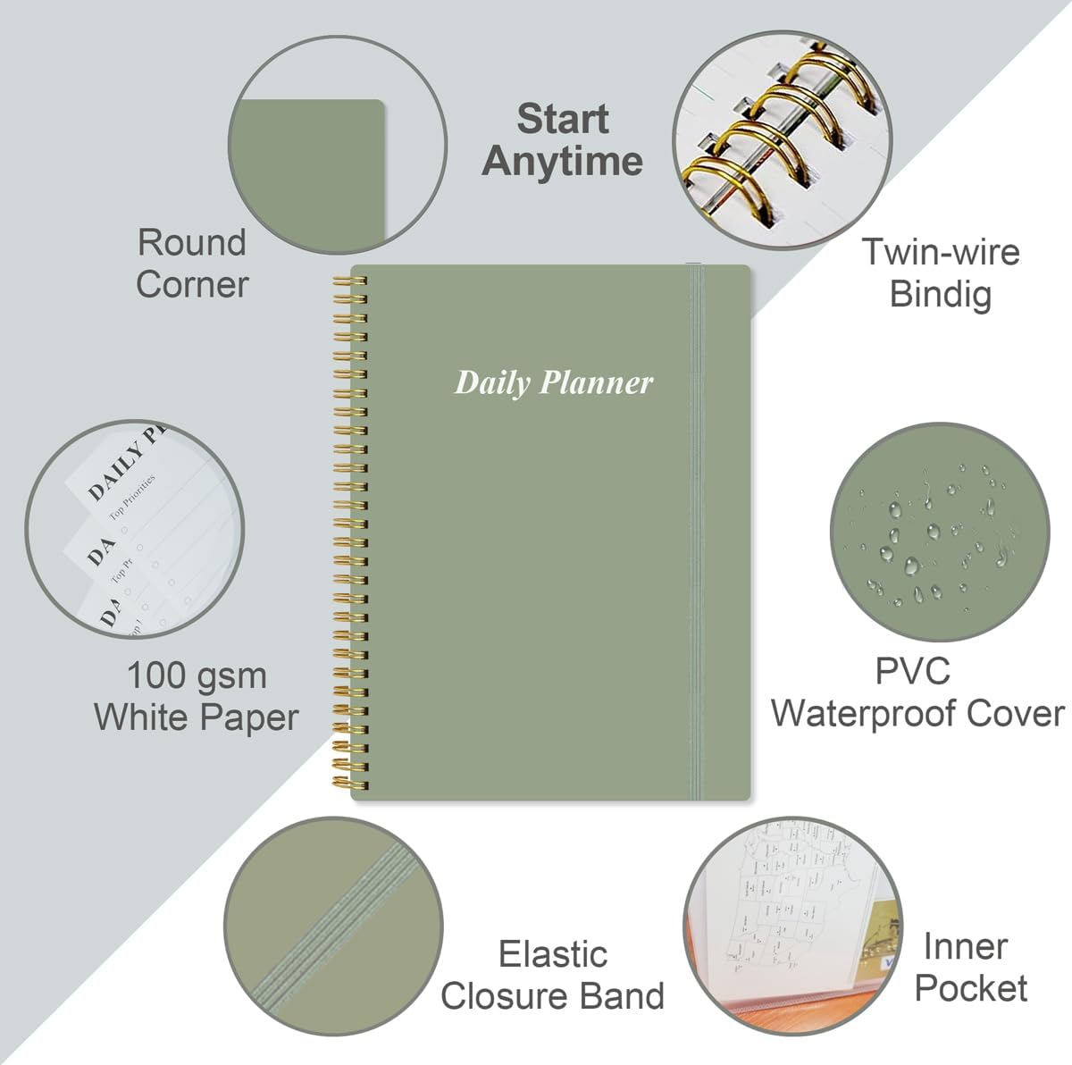 Daily Planner Undated - B5 To Do List Notebook Hourly Schedules, Spiral Appointment Planner for Women and Men, PVC Hardcover, Inner Pocket, Elastic Closure, 7" x 10", Green