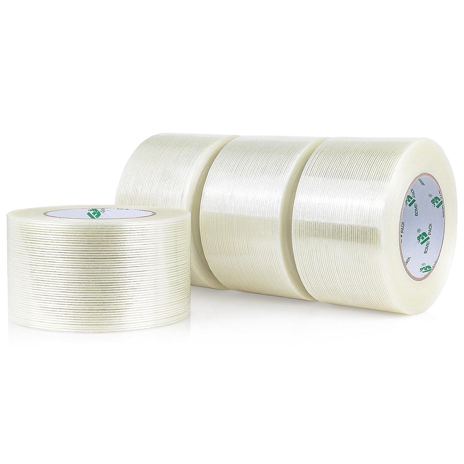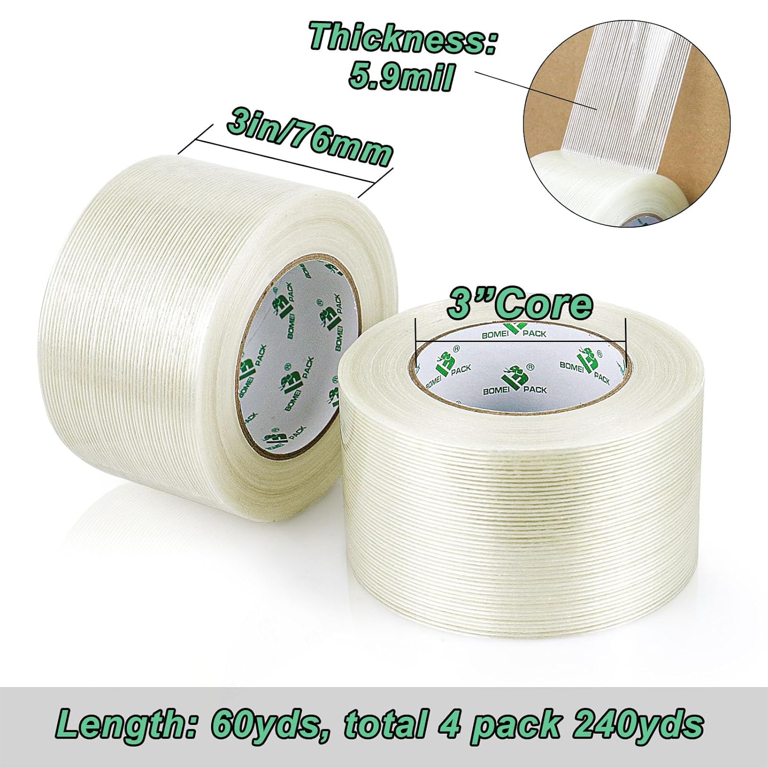BOMEI PACK Fiber Reinforced Packing Tape 3 Inch, Heavy Duty Wide Strapping Tape, 4Rolls x 5.9Mil x 60Yds, Total 240Yds