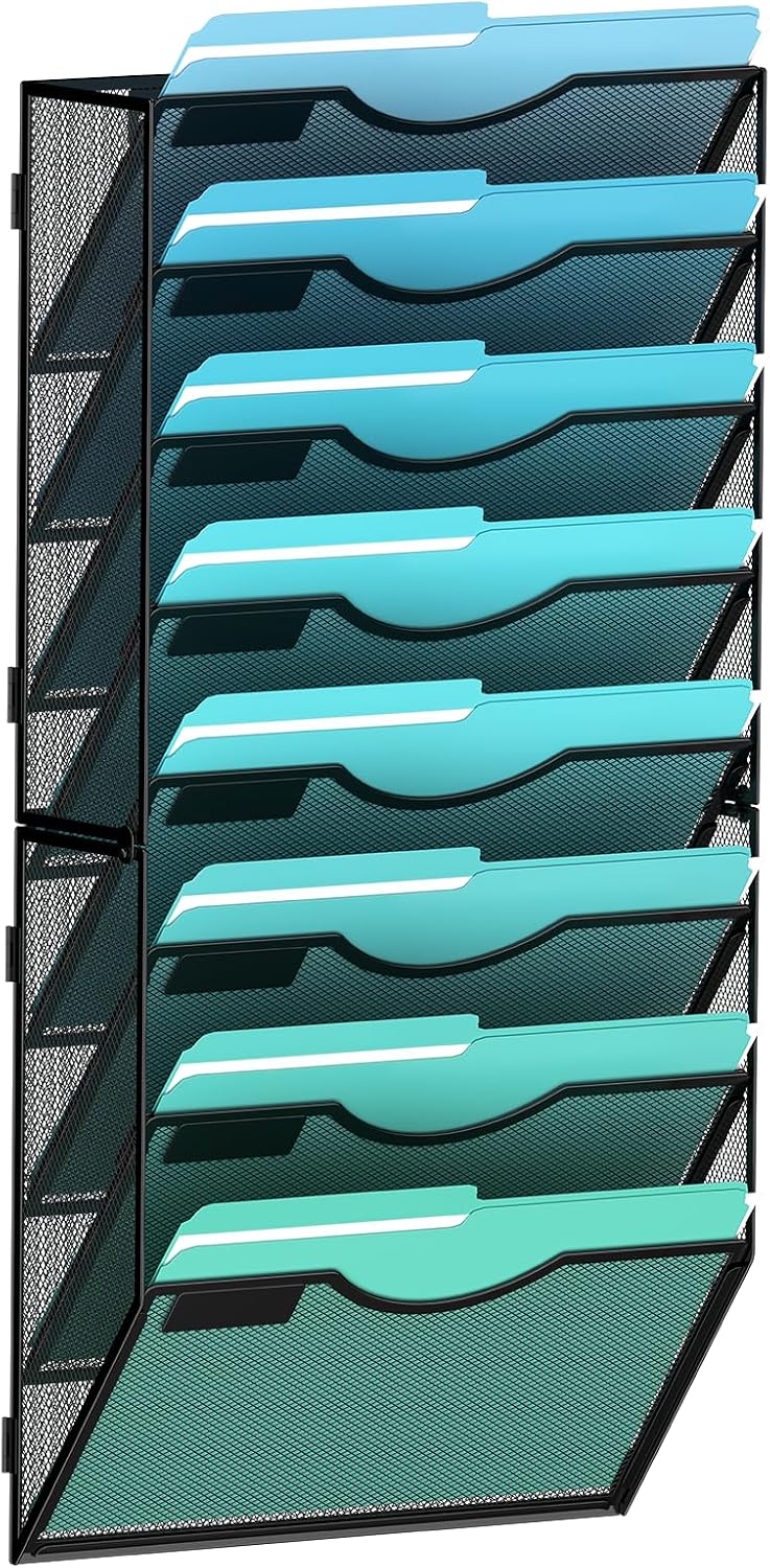 8-Tier Wall File Organizer Hanging Wall File Holder Wall Mount Paper Folder Organize, Mesh Magazine Document Mail Organizer Wall Organizer for Office School Home, Black