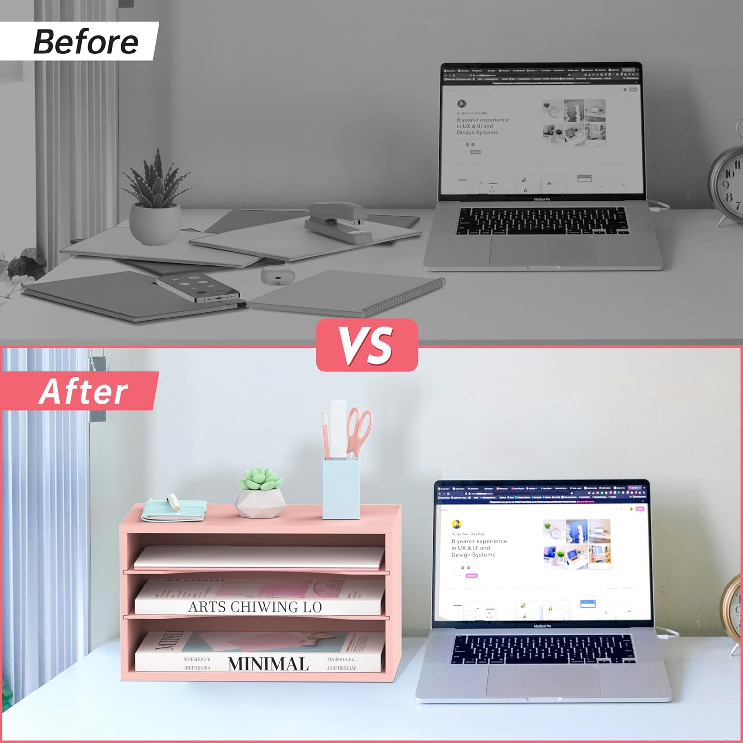 SUPEASY Wood Desk Organizer, 3 Tier Paper File Organizer for Desk, Wooden Desktop Organizer, Paper Letter Literature Mail Sorter, for Office School & Home Organization, Pink