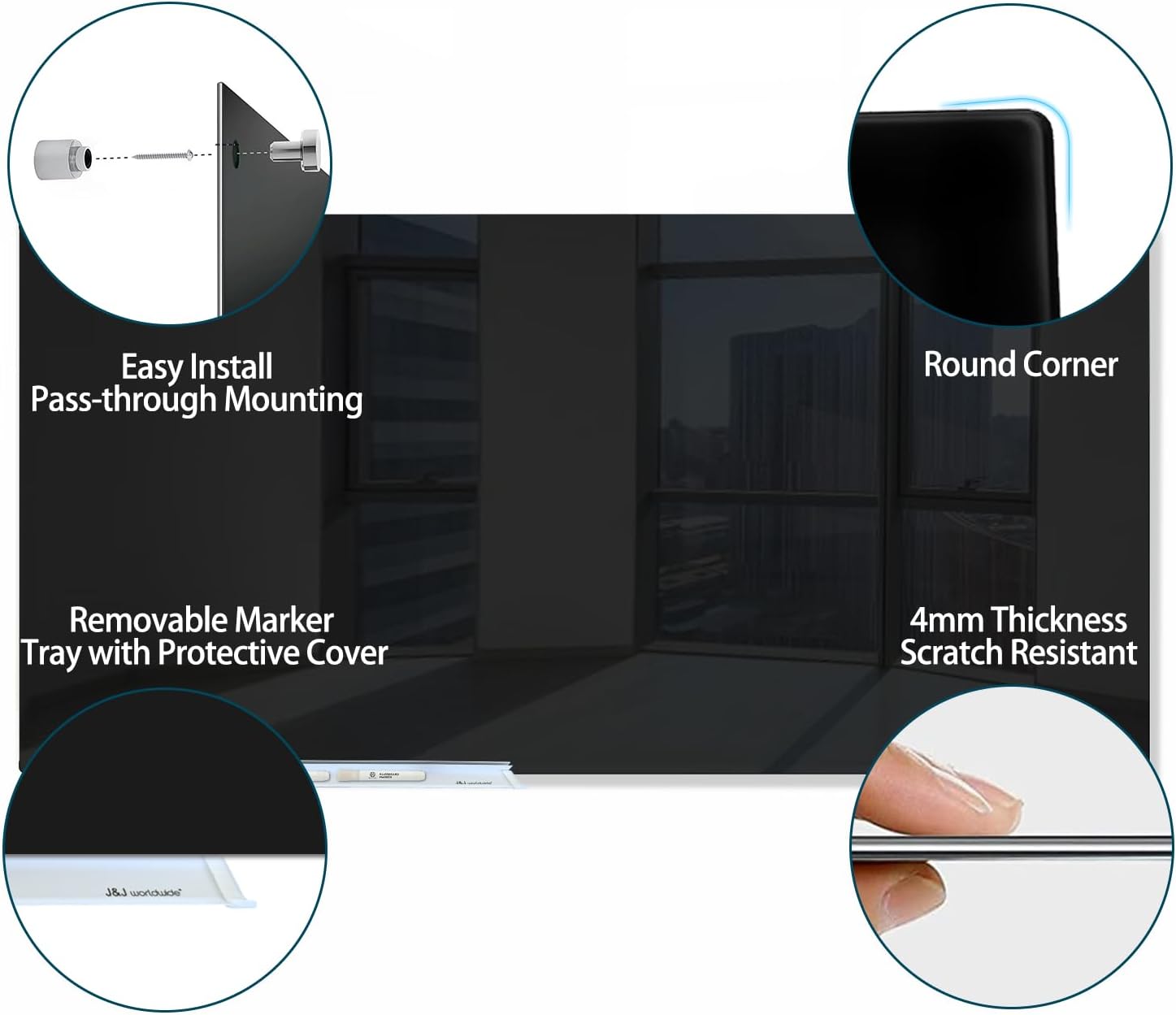 J&J worldwide Glass Whiteboard 6' x 4', Magnetic Black Glass Dry Erase Board, Black White Board Frameless, Includes Markers, Magnets, Marker Tray, Eraser for Wall, Office, Home, School