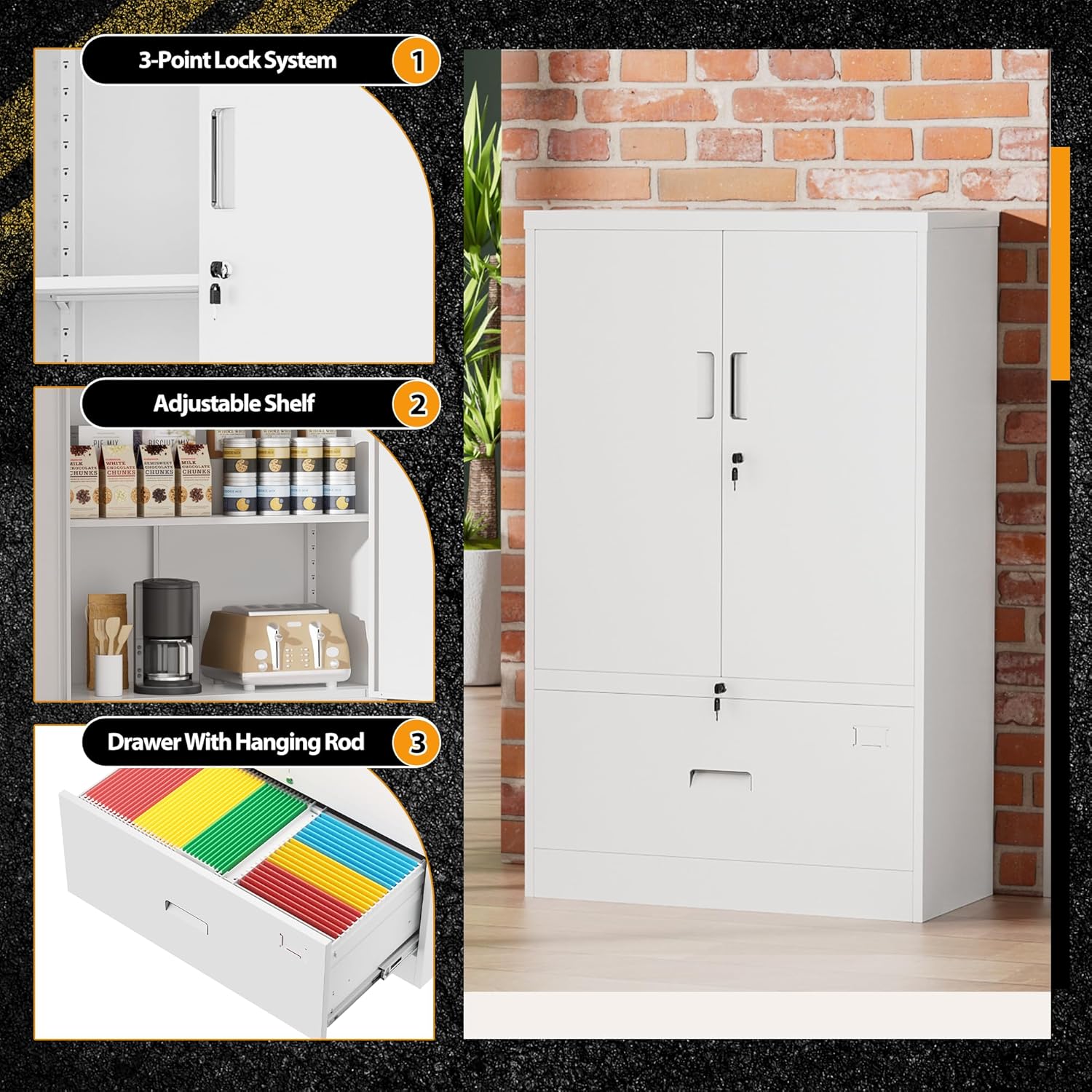 - [Modern&Locking Design]:Greenvelly steel storage cabinets use the concept of simple design, the up cabinet design uses a 3-point lock system, which further improves privacy. The down drawer is also equipped with a locking device, we also designed a card box to facilitate your storage of the distinction.Meanwhile, we provide 4 keys, the lock block is designed to effectively protect your various valuable documents and belongings