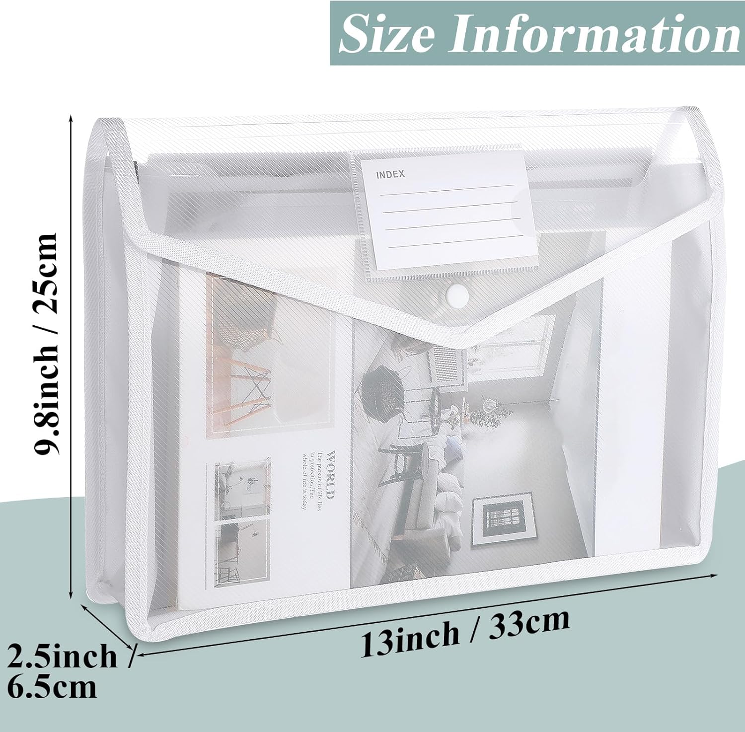 - Enough capacity storage: the A4 envelope expanding file measures 13 x 9.8 x 2.5 inches/ 33 x 25 x 6.5 cm, suitable for storing notebooks, magazine, paperwork, contract, important documents, certificates, business cards, tax receipts, even tablets, cosmetic and more