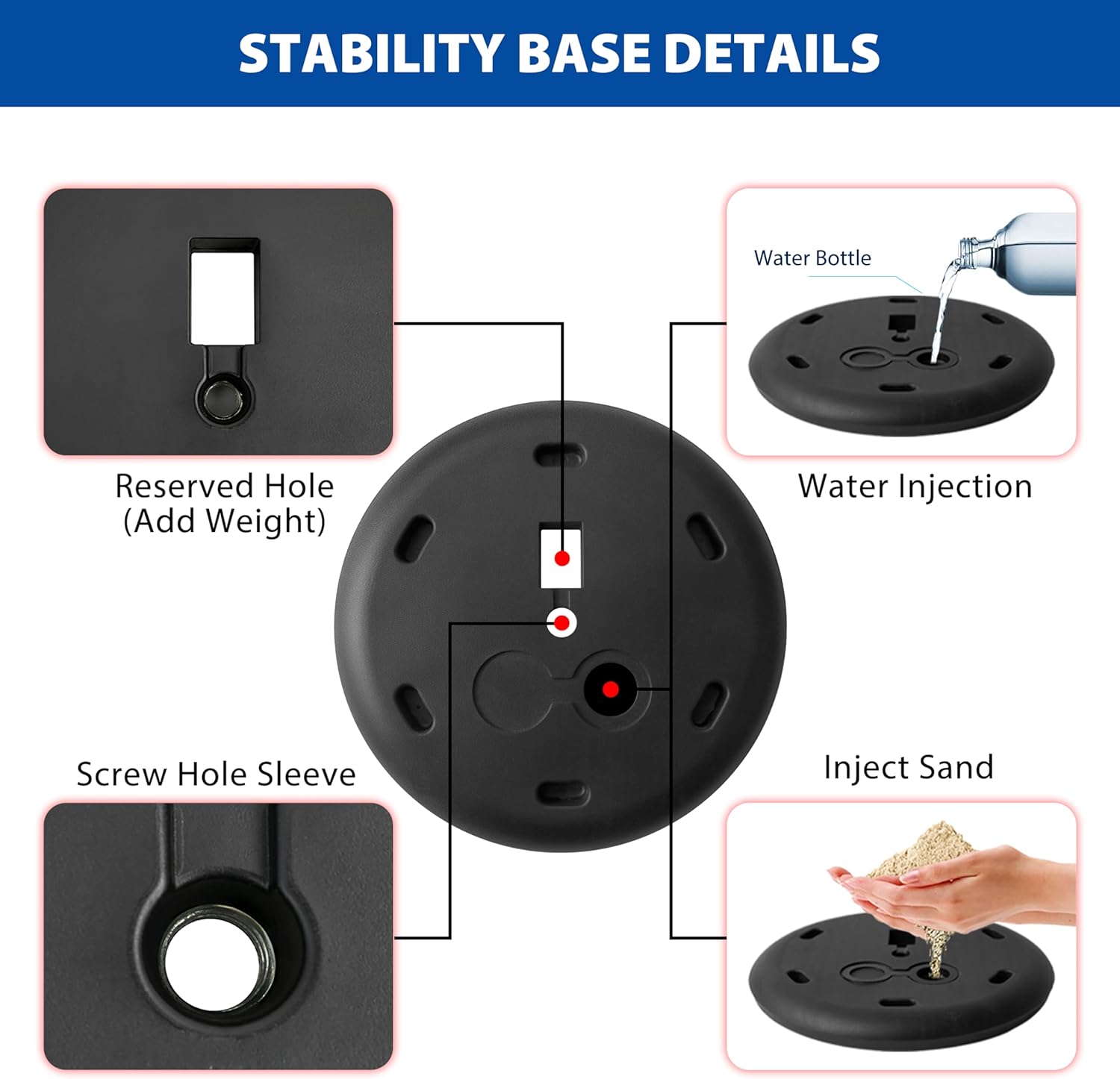 - ✔Heavy Duty Stable Base: The standing sign holder features a sturdy metal base with non-slip rubber strip to protect the floor from scratches. For balance, you can also add water or sand to the rubber base for added stability for outdoor use