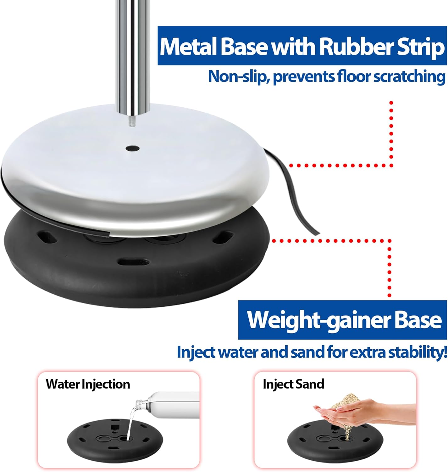 - ✔Heavy Duty Stable Base: The standing sign holder features a sturdy metal base with non-slip rubber strip to protect the floor from scratches. For balance, you can also add water or sand to the rubber base for added stability for outdoor use