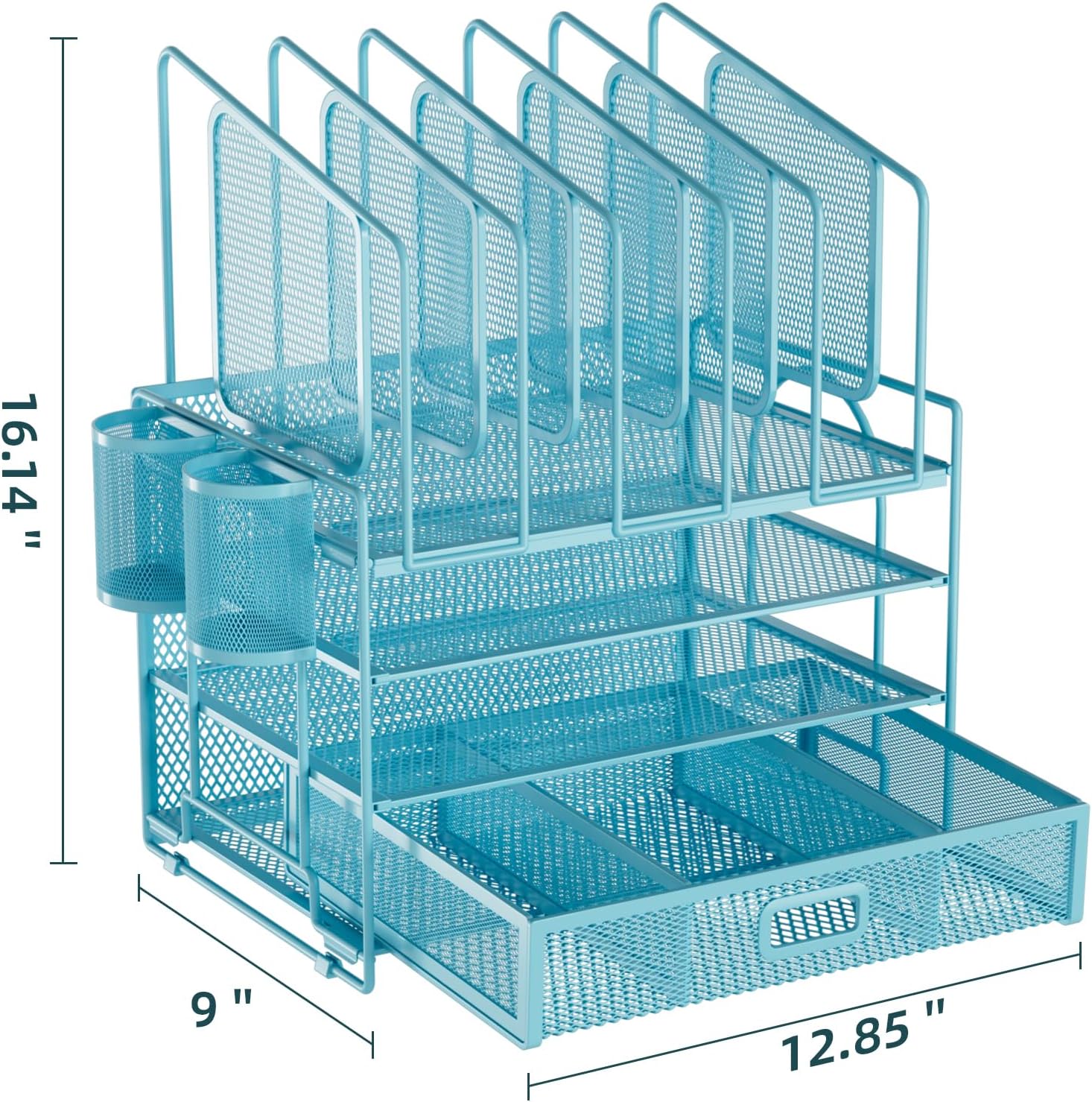 Marbrasse Desk Organizers, 4-Tier Mesh Desk File Organizer with 5 Vertical File Holders and 2 Pen Holders, Multifunction Desktop Organizer,Desk Organizers and Accessories for Home Office (Blue)