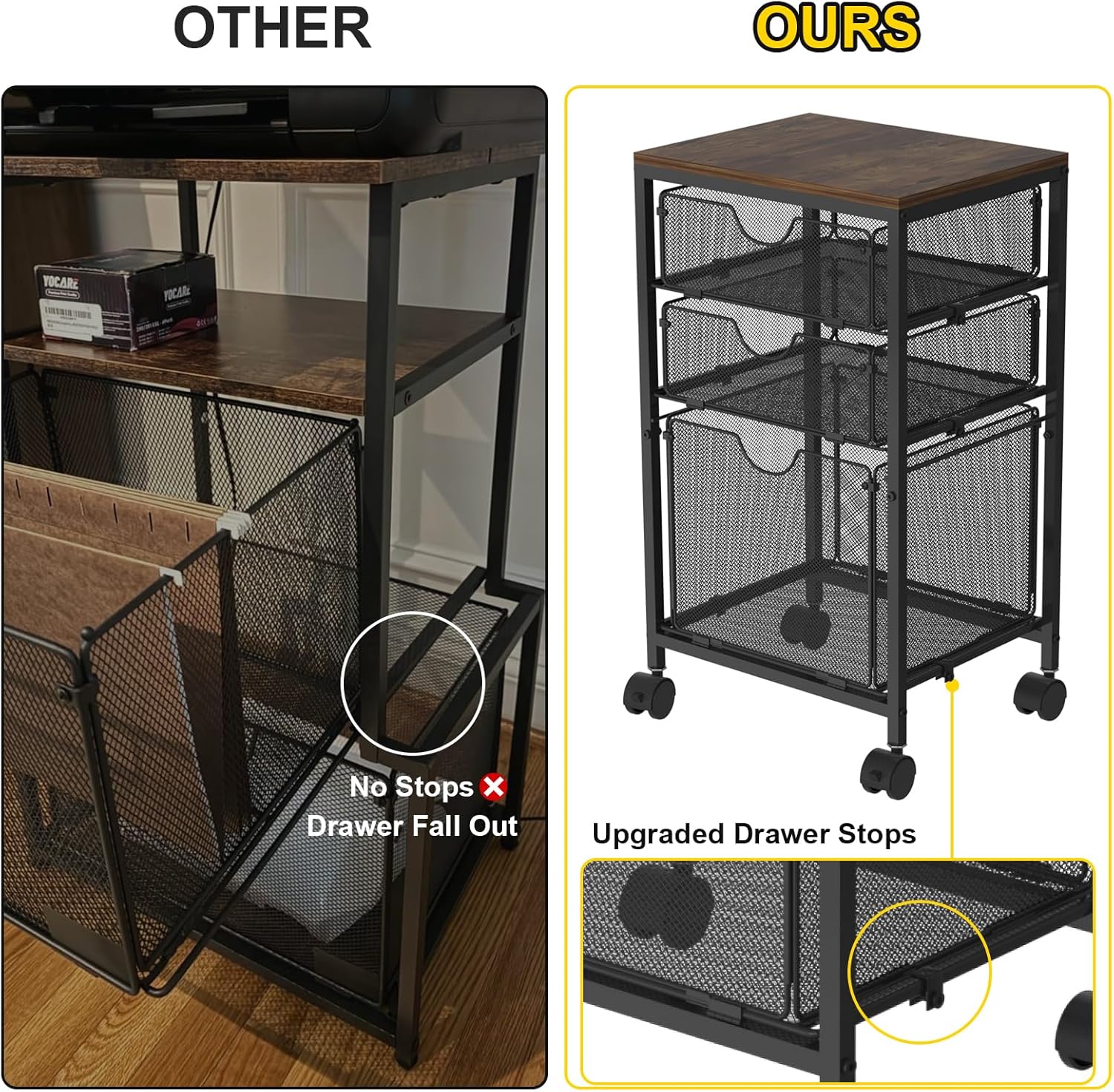 Rolling File Cart with 3 Storage Drawers, Wood & Mesh Hanging File Folder Organizer with Wheels Under Desk, File Cabinets for Home Office, 11.81" D x 14.8" W x 25.39" H, Black