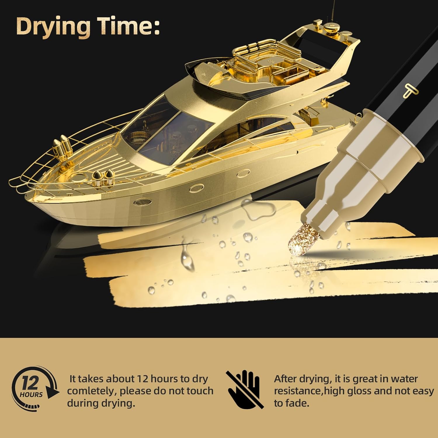 - Versatile Application: These permanent gold marker pens is best used on smooth and non-absorbent surfaces such as metal, glass, rock, ceramic, plastic, gypsum, clay, jewelry, leather and more, the paint’s metallic finish adds brilliance to your creations, making it perfect for a variety of DIY projects. Perfect for detailing trim or coloring model cars, and add character to daily creations like illustrations, custom paintings, signature.
