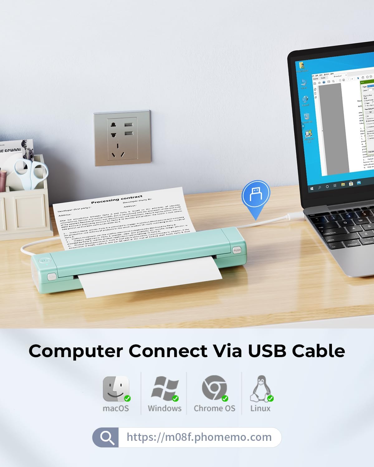 - Phone PrinterăStrong CompatibilityăPrint PDF, Word, Images, Web from your phoneâwhenever, wherever. You can also use a USB cable to connect for computer printing; (PC devices only works with USB connection, needs to download the driver first: m08f.phomemo.com)