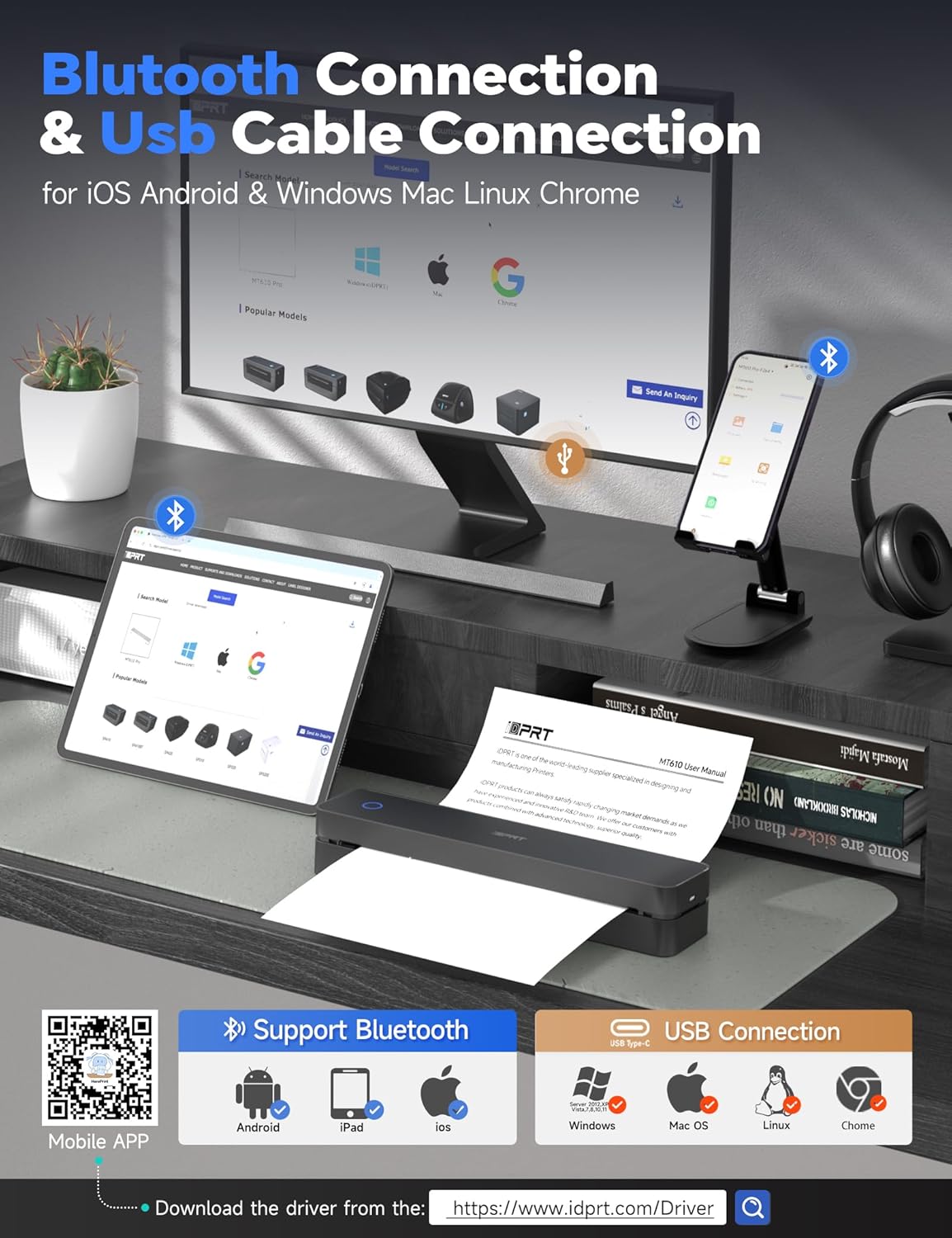 - ā COMPUTER-DRIVEN PRINT:Step 1: Connect the MT610 Pro to your computer using a USB-C cable and power it on. Step 2: Download the appropriate driver for your computer's operating system from the brand's official website and install it. Step 3: Load thermal paper into the MT610 printer. On your PC, select the file, set the corresponding paper size, and start printing.