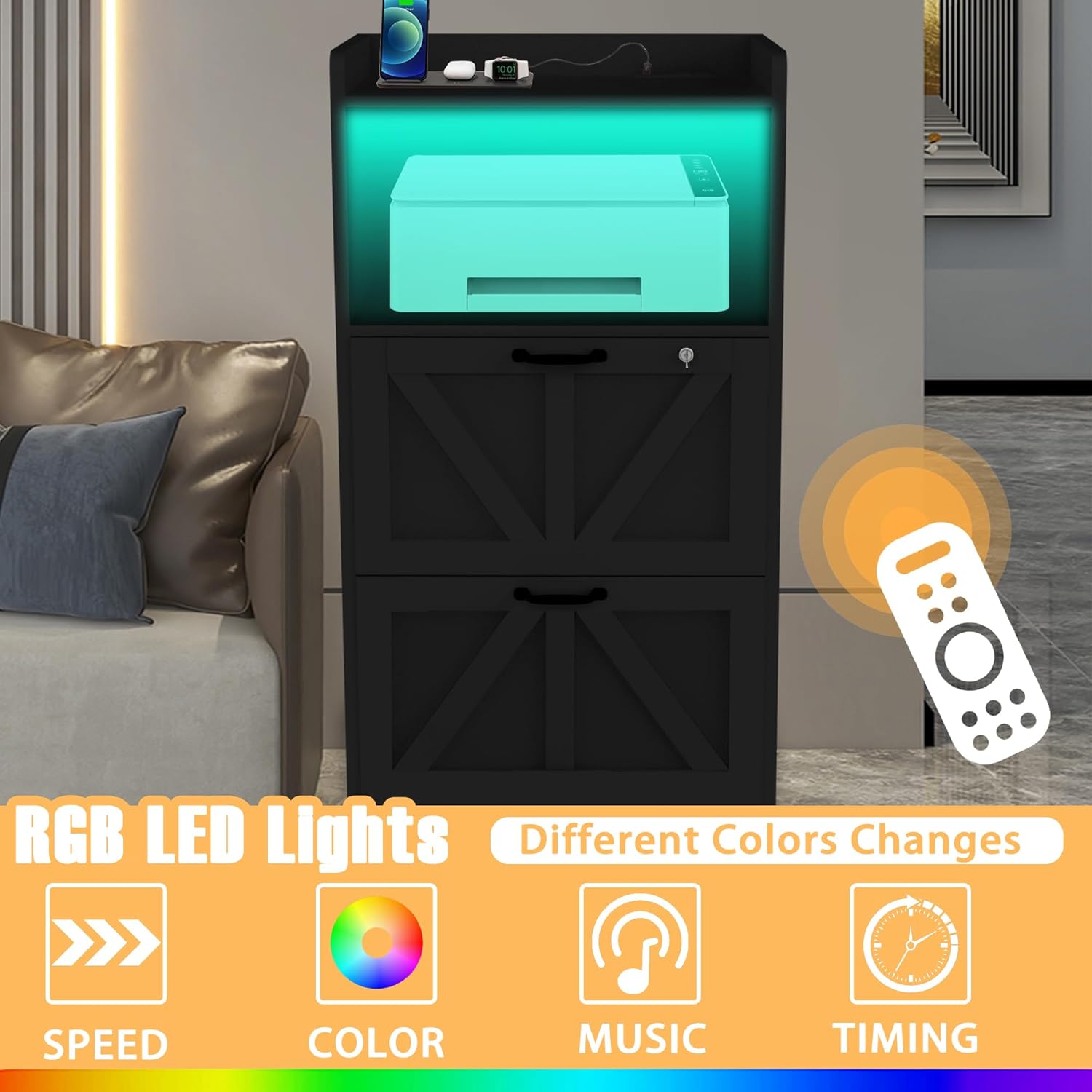 2 Drawer Lateral File Cabinet with Charging Station, Wood Filing Cabinet with Lock & LED Light, Large Storage Printer Stand for Home Office, Black