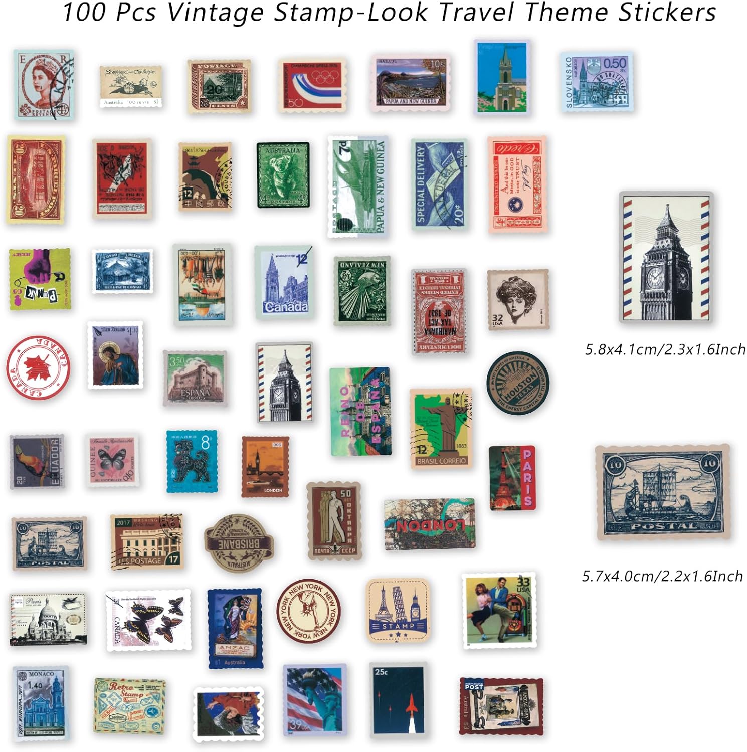 - Size & Quantity : Each package comes with 100 pieces of assorted old stamp stickers in various style, 50 designs / 2 of each. Sticker size 1 to 3 inches. They are opaque,not translucent washi stickers.