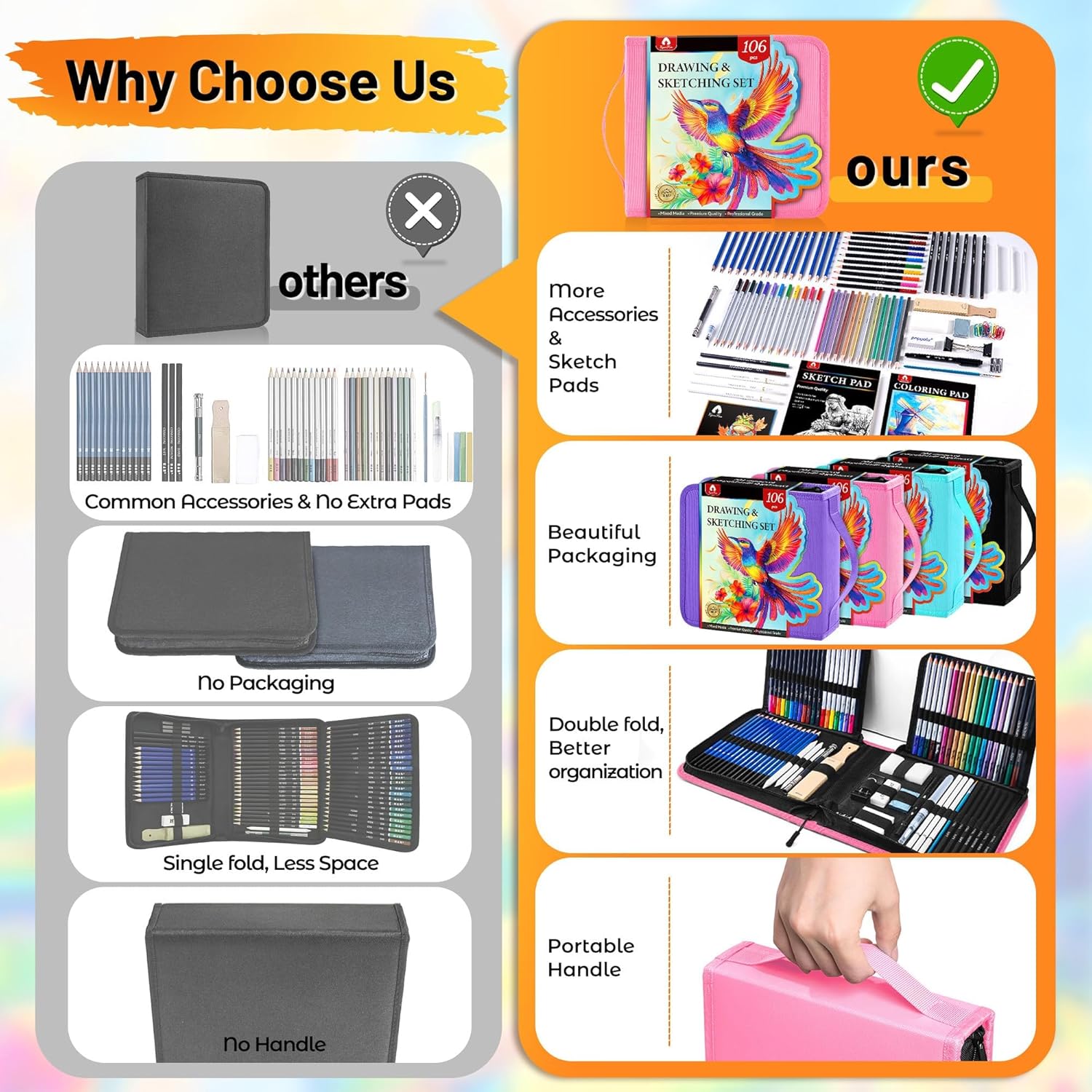 - 106 PCS Professional Drawing Kit Sketching Supplies: All you need are in this portable art case whether you are a professional or a beginner. It includes all the art supplies, specially added 3-color sketchbook and coloring book. Perfect for drawing, sketching, shading, blending, layering and adult coloring books. With our professional drawing supplies kits, let your imagination flow and bring your ideas to your artistic journey