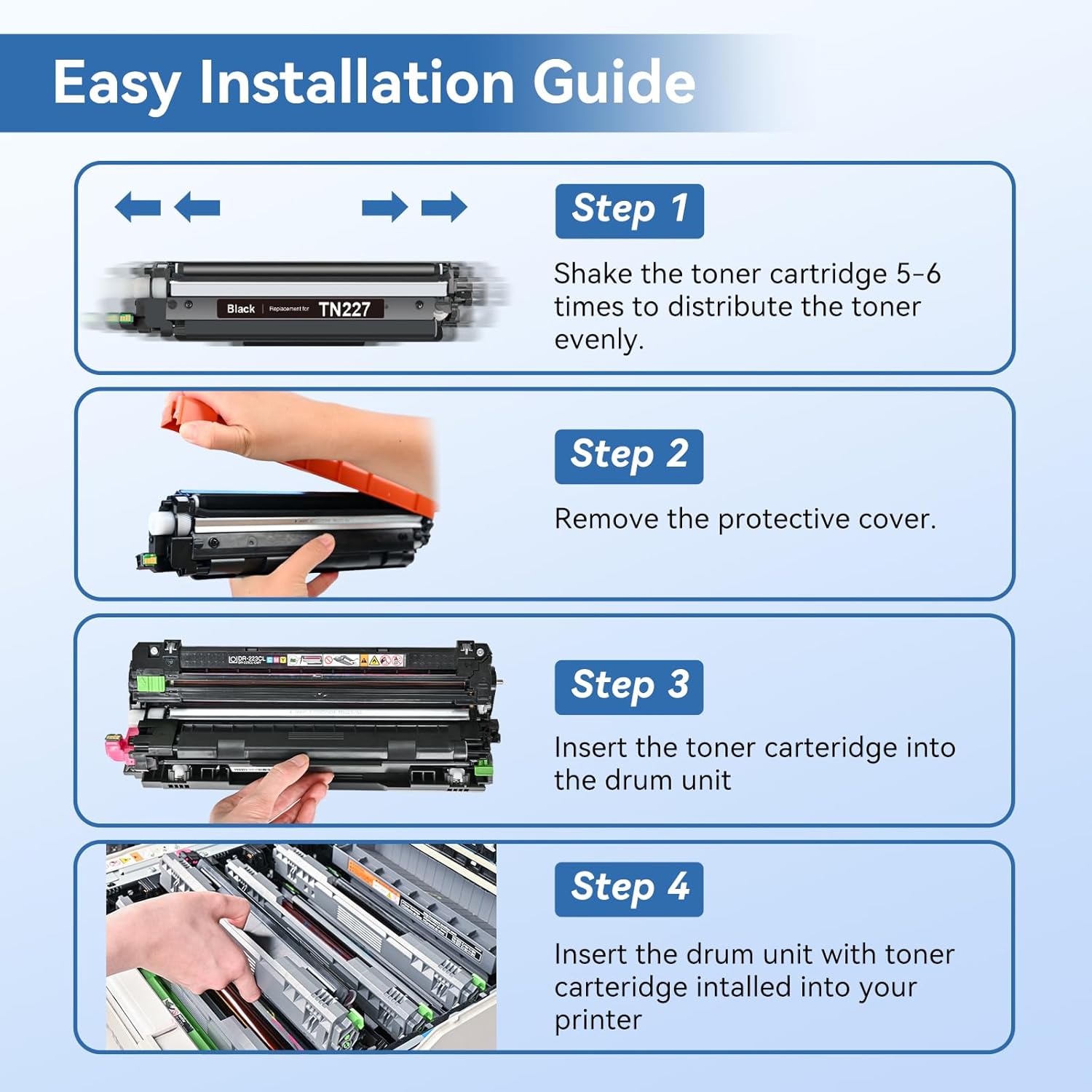 - High Performance: Our TN227 High Yield Toner Cartridge 4 Pack are Compatible for TN-227BK/C/M/Y High Yield Brother, TN223 BK/C/M/Y Toner Offering you Superior Print Quality with Sharp, Clear Text and Vivid, Striking Colors
