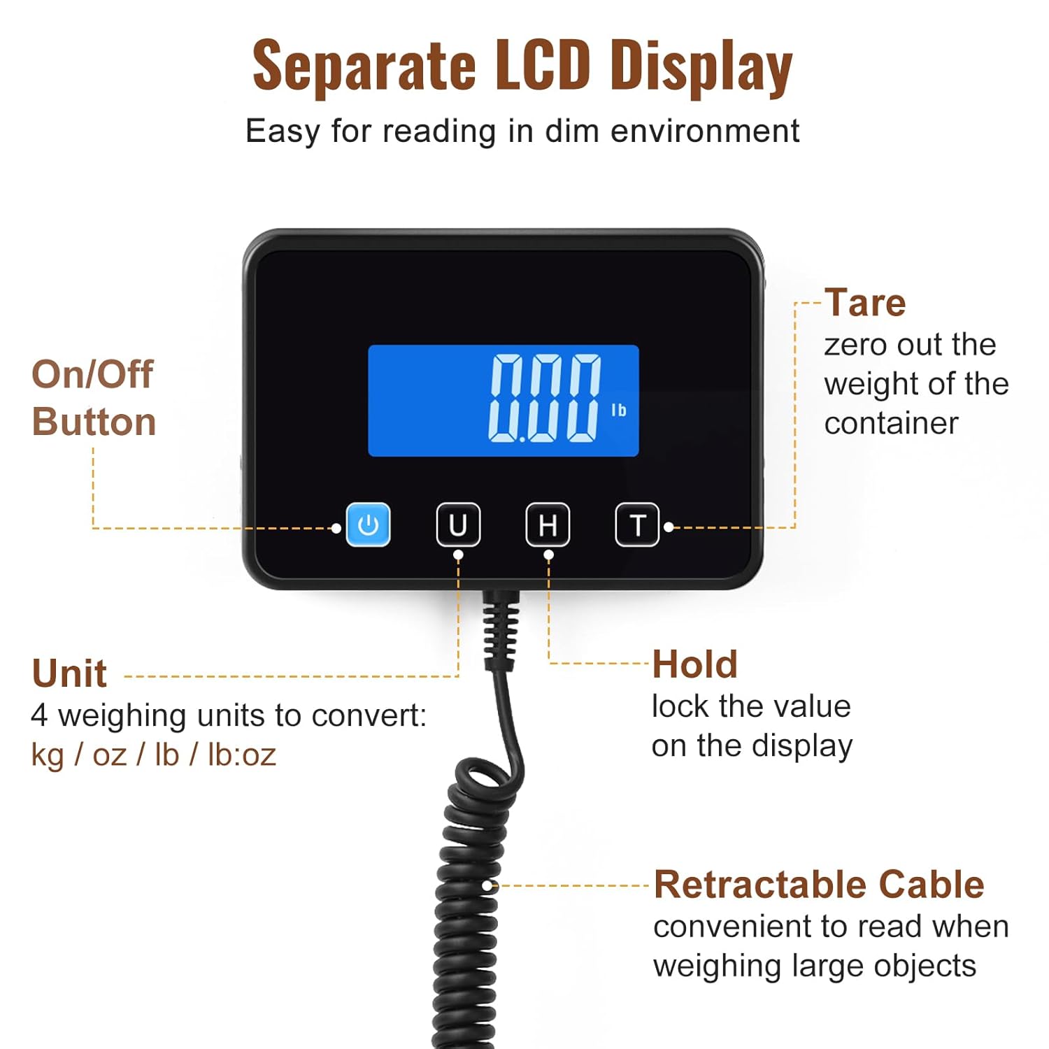 - 【Tare & Hold Functions】: The TARE function zeroes out the weight of the container and gets the net weight. The HOLD function is to lock the weighing value on the display which makes it simple to read the weighing value when large items are blocking the view. Supports 4 units to convert: kg, oz, lb, lb: oz