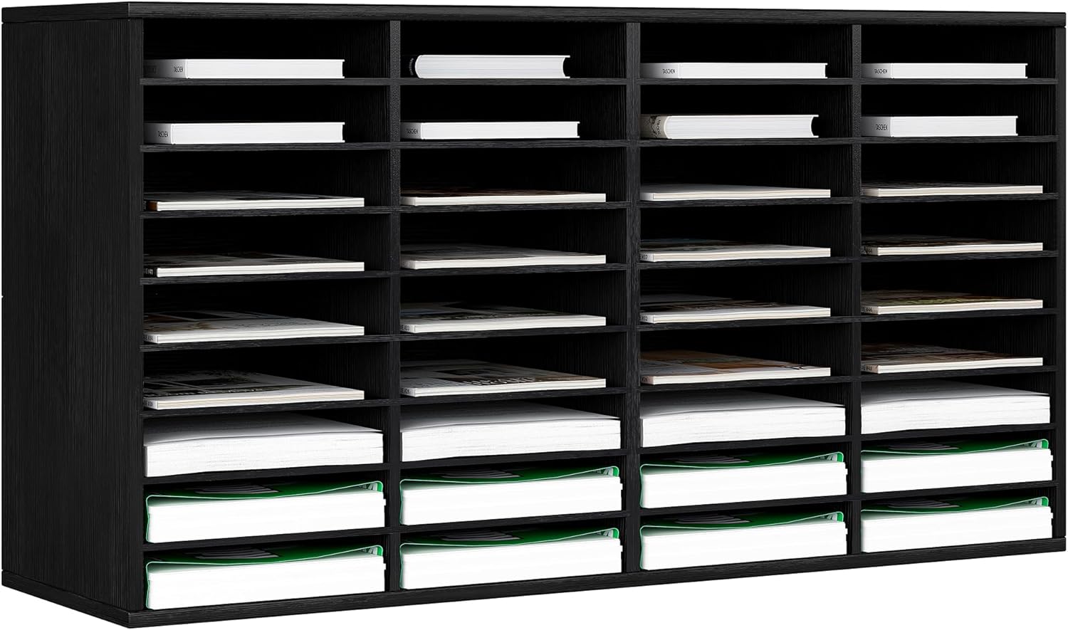 - 36-Compartment Mail Sorter Organizer: Hold 500+ A4 paper sheets in each compartment in this mail organizer. With 36 compartments (12 x 9 x 2.1 inch eash slots), store comics, magazines, and travel brochures effortlessly. EPA-certified particleboard ensures long-term durability for office/classroom use.