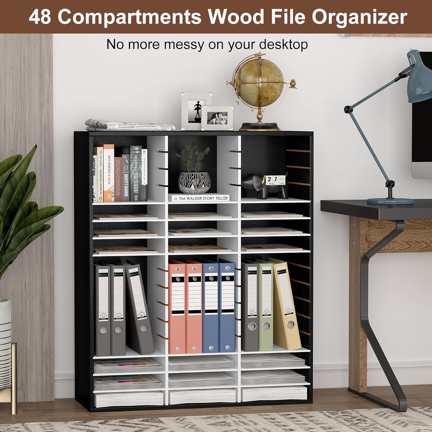 EasyPAG Mail Organizer Countertop, Wood Literature Organizer with Adjustable Shelves, Student Classroom Mailbox for School, Desktop Paper Sorter for Office Home, 48 Compartments, Black/White