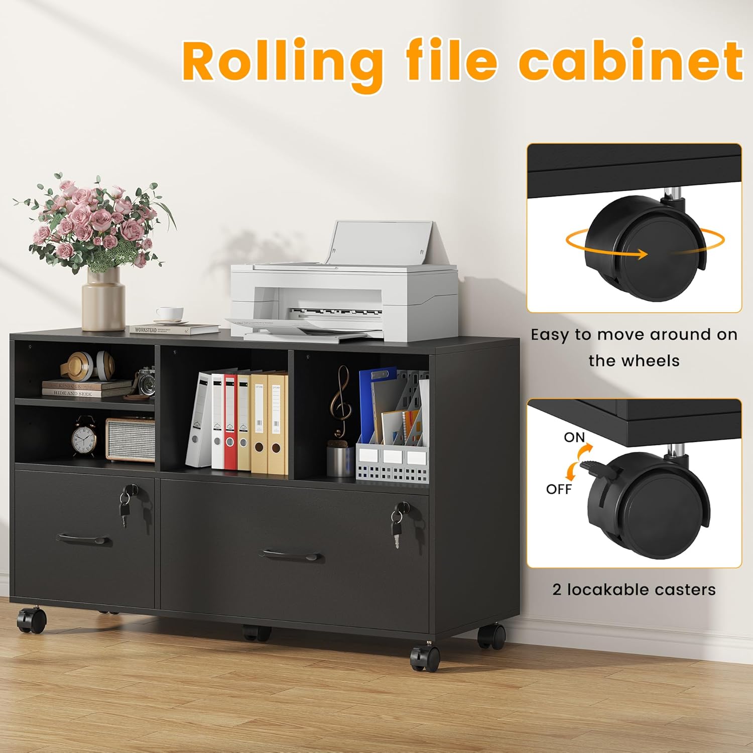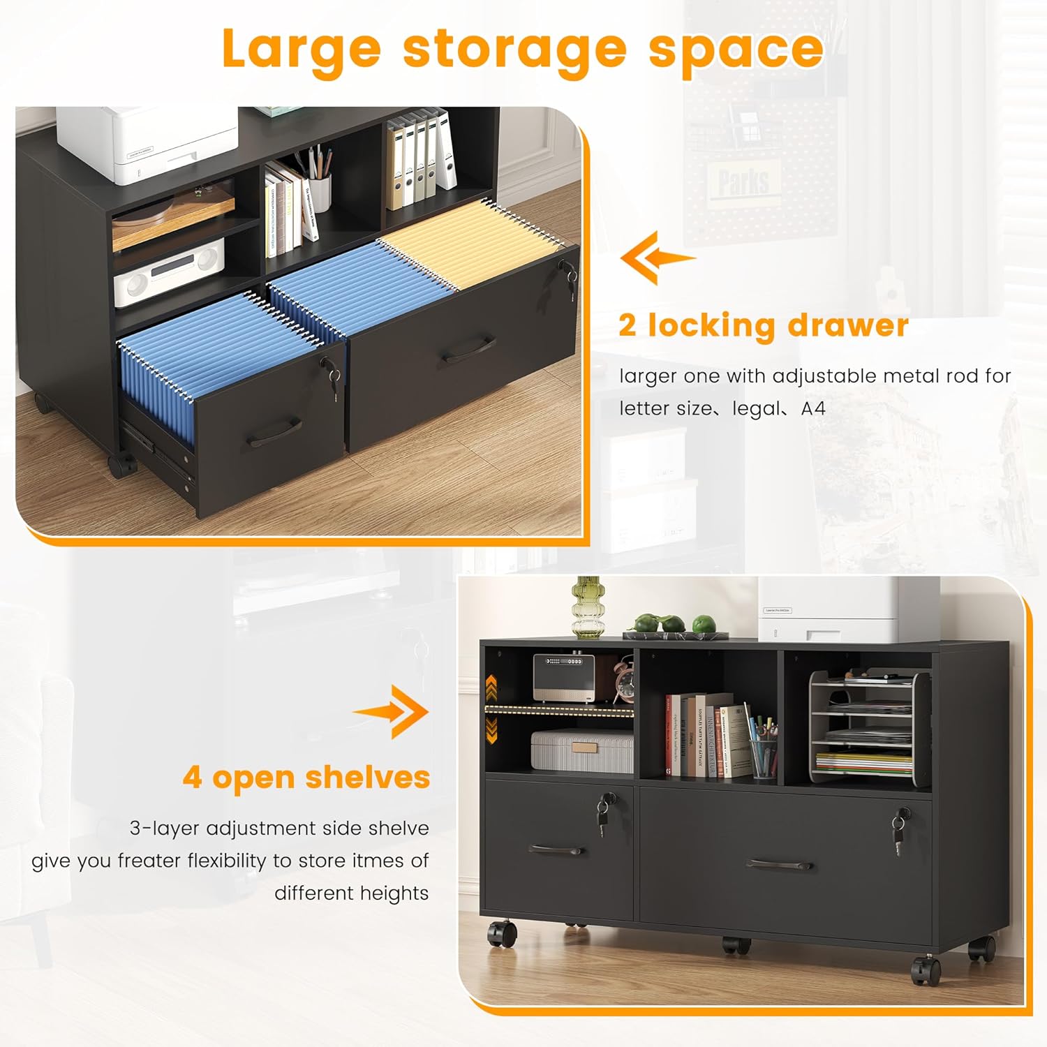 2 Drawer Wood Mobile Large Lateral File Cabinet with Lock, Lockable Rolling Filing Cabinet with Storage Shelves, Printer Stand Office Storage for Home Office Fits Files Legal/A4,Black