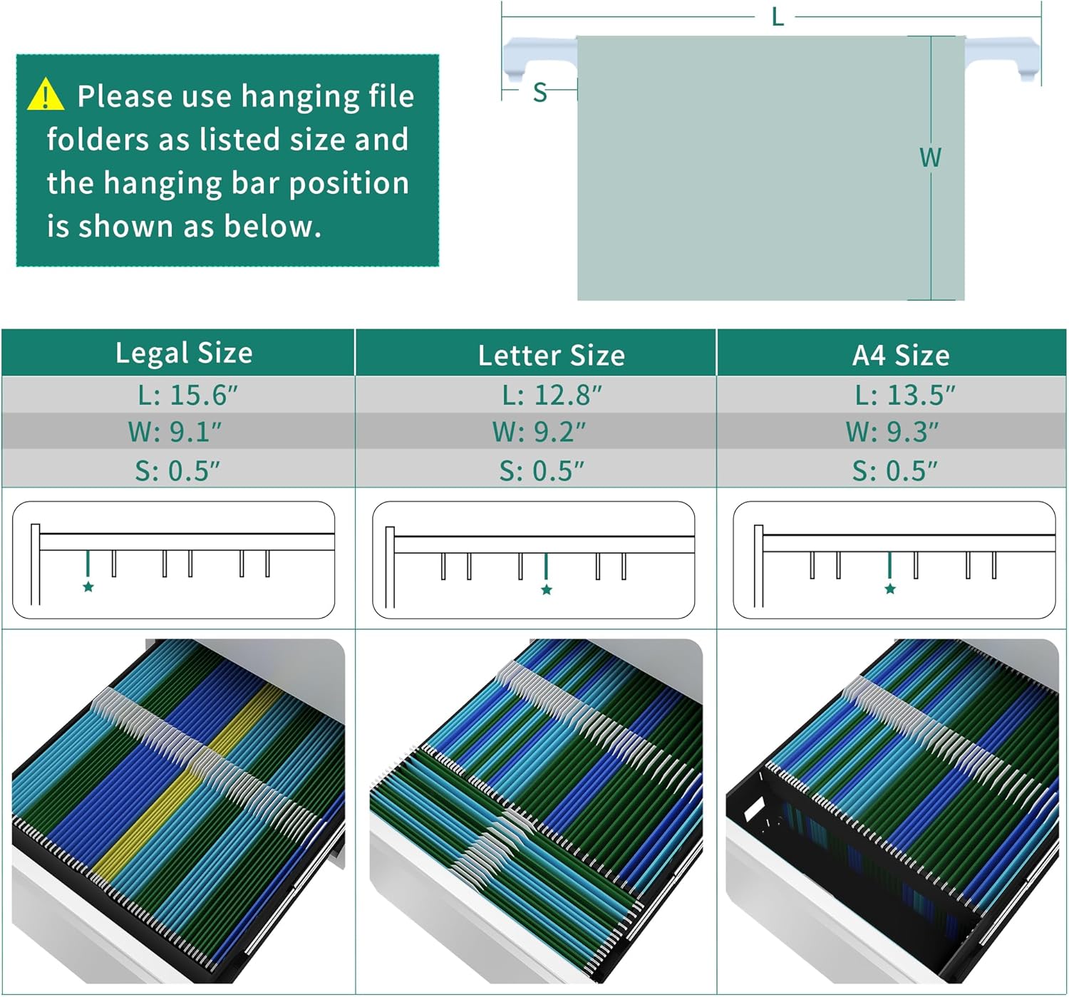 - Large storage drawer: Two drawer file cabinet provide large storage space, each drawer provides movable hanging bar, can allow letter size documents to be hung horizontally and vertically, legal and A4 size documents can only be hung vertically, not horizontally; Please carefully measure the size of your desk and documents before purchasing, so that you can better store and organize your documents.