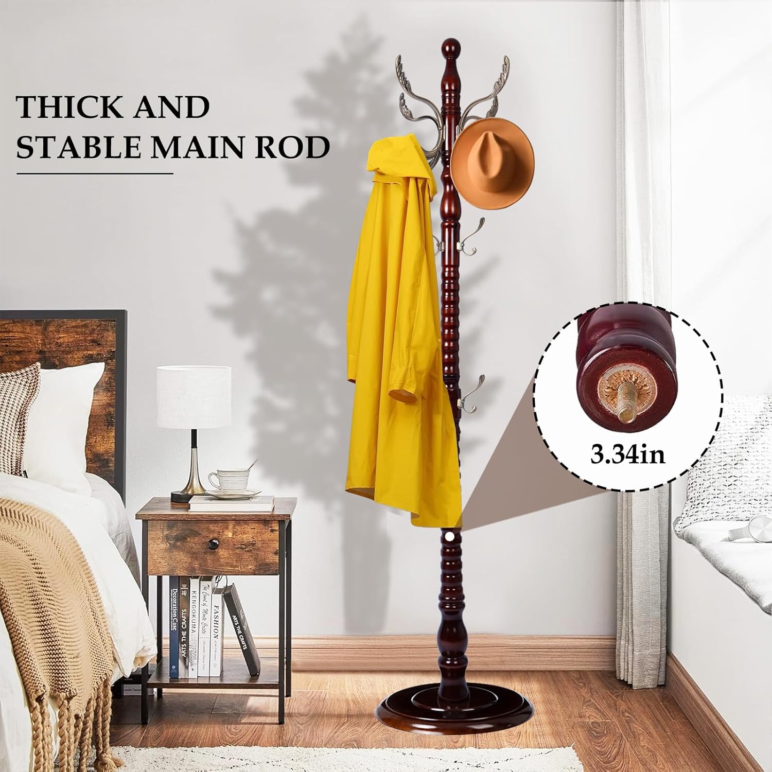 - 【A Stable Tree】 What good is a coat rack that falls over the moment you put a coat on the hook? Our coat tree made with 3.34" bold, solid wood pole and 16.92" diameter heavy-duty disc base, so you can tidy your room with confidence.
