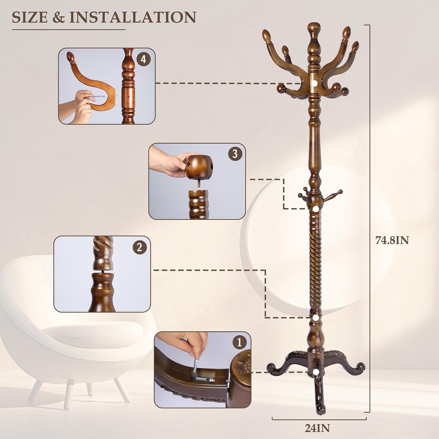 - 【A Stable Tree】 What good is a coat rack that falls over the moment you put a coat on the hook? Our coat tree made with 3.8" bold, solid wood pole and 24" diameter tri-legged base heavy-duty base, so you can tidy your room with confidence.