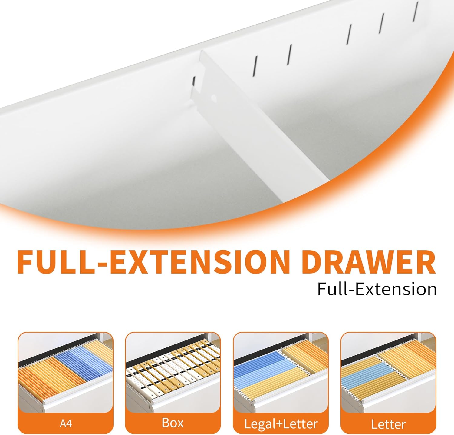 - 【Unique Design】 The steel file cabinet features precision ball bearing full suspension slides, ensuring silent and smooth opening and closing of the drawers. With a full extension drawer design and humanized handles, this locking cabinet offers convenient and effortless functionality.
