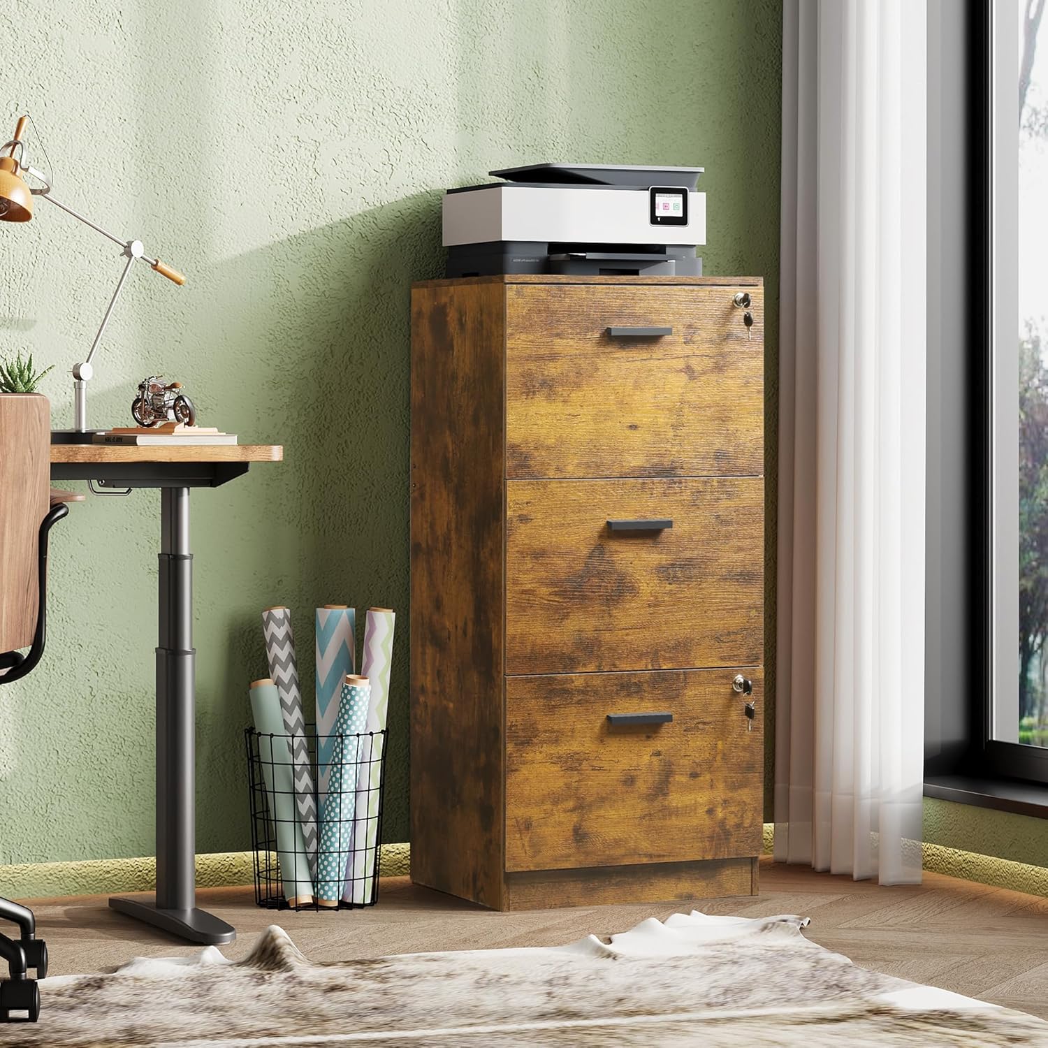 DEVAISE 3 Drawer File Cabinet with Lock, Vertical Wood Filing Cabinet for Home Office, Printer Stand for Letter and A4 Size, Rustic Brown