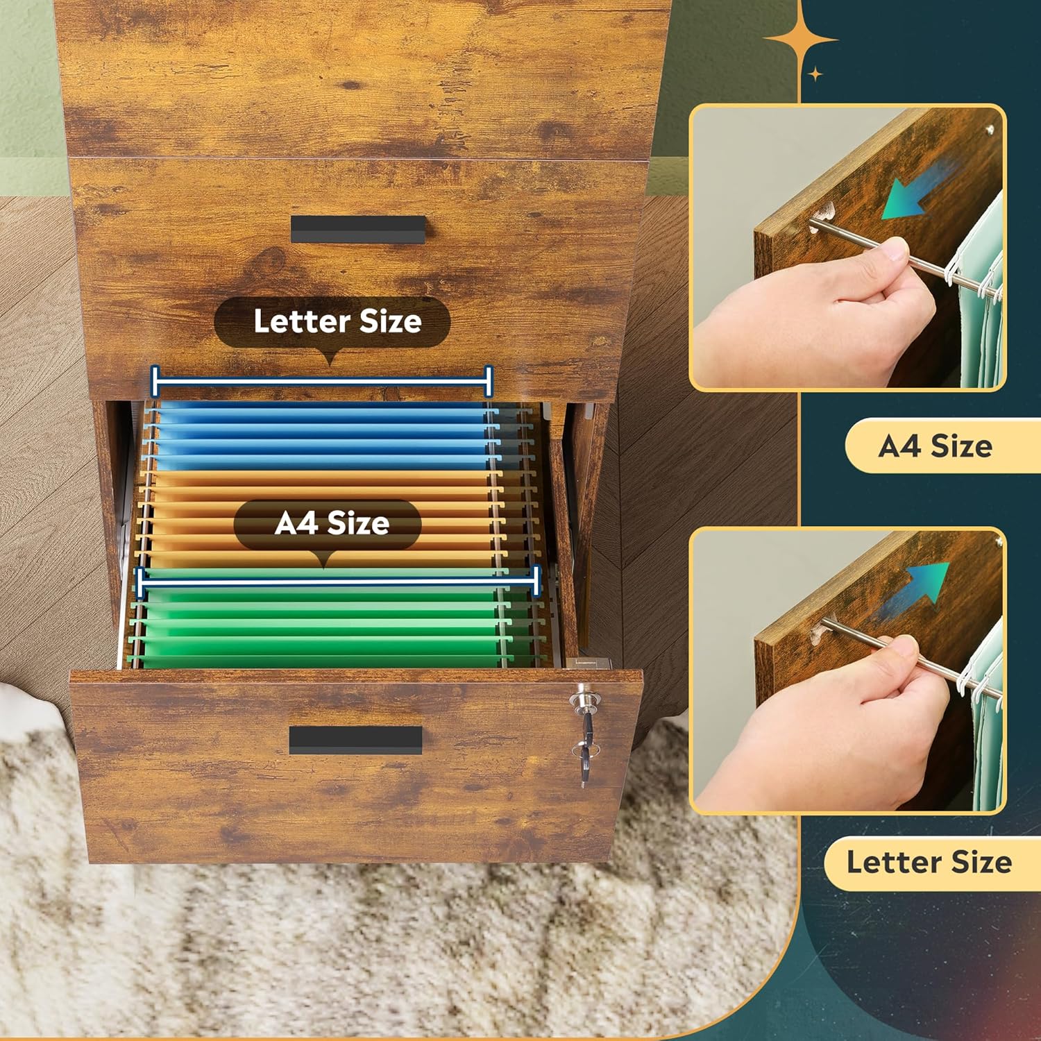 - ăDurable & Reliable ConstructionăCrafted from durable, high-quality wood, this file cabinet can hold up to 77 pounds, ensuring stability and durability for a reliable storage solution that lasts.