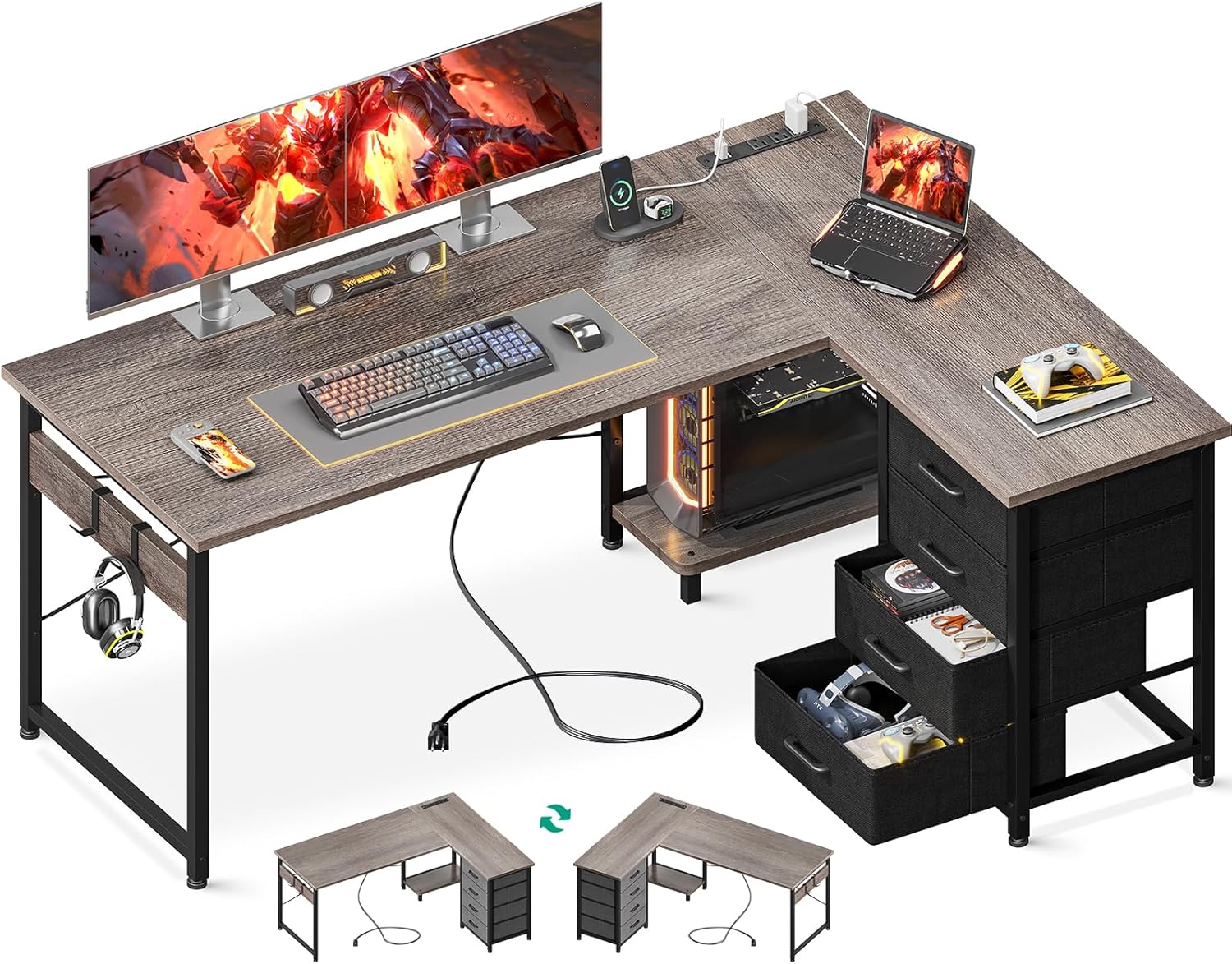 Casaottima L Shaped Desk with 4 Tier Drawers, 53" Gaming Desk with Power Outlets & USB, Reversible L-shaped Computer Desk with CPU Stand, Home Office Corner Table with Storage, Easy Assemble, Grey Oak