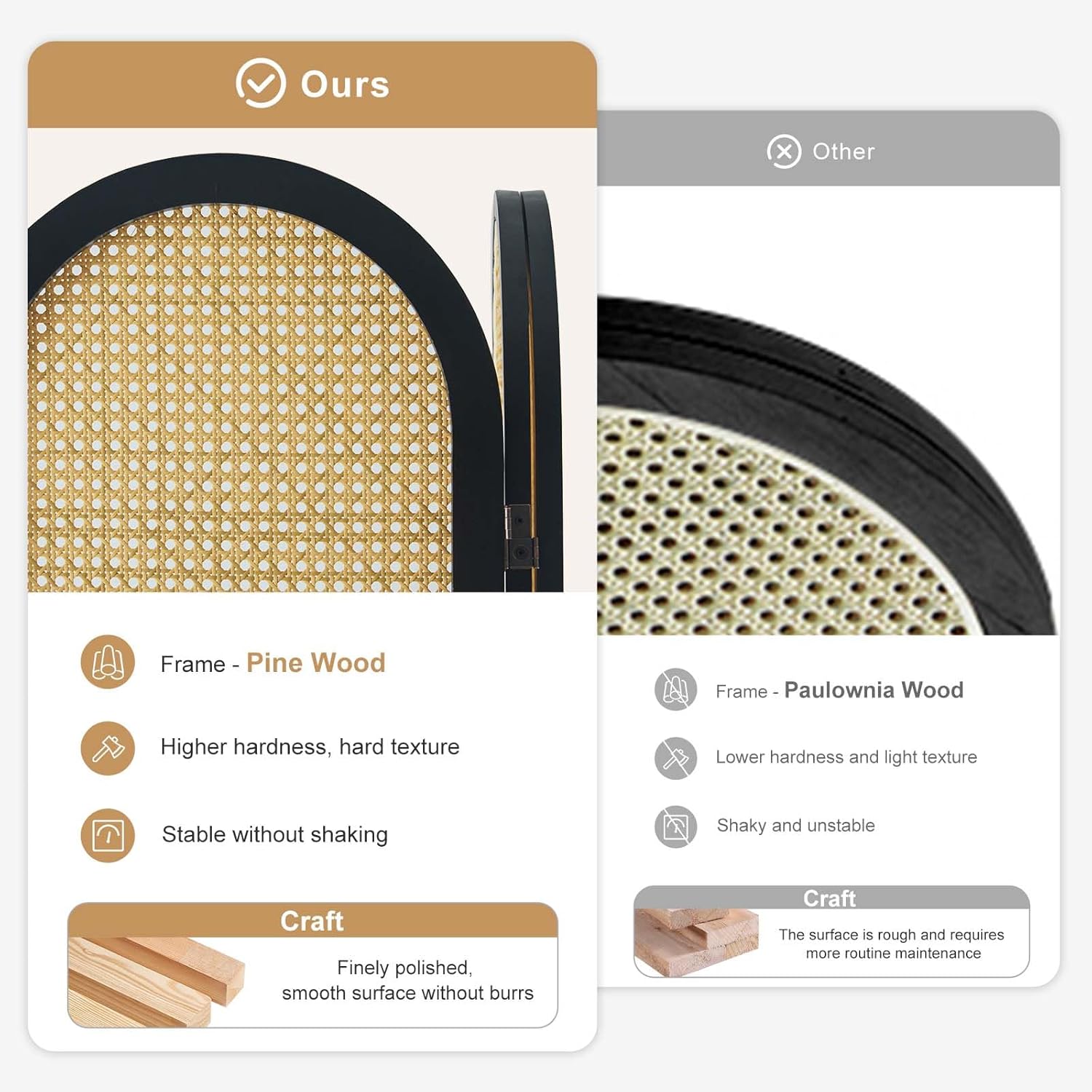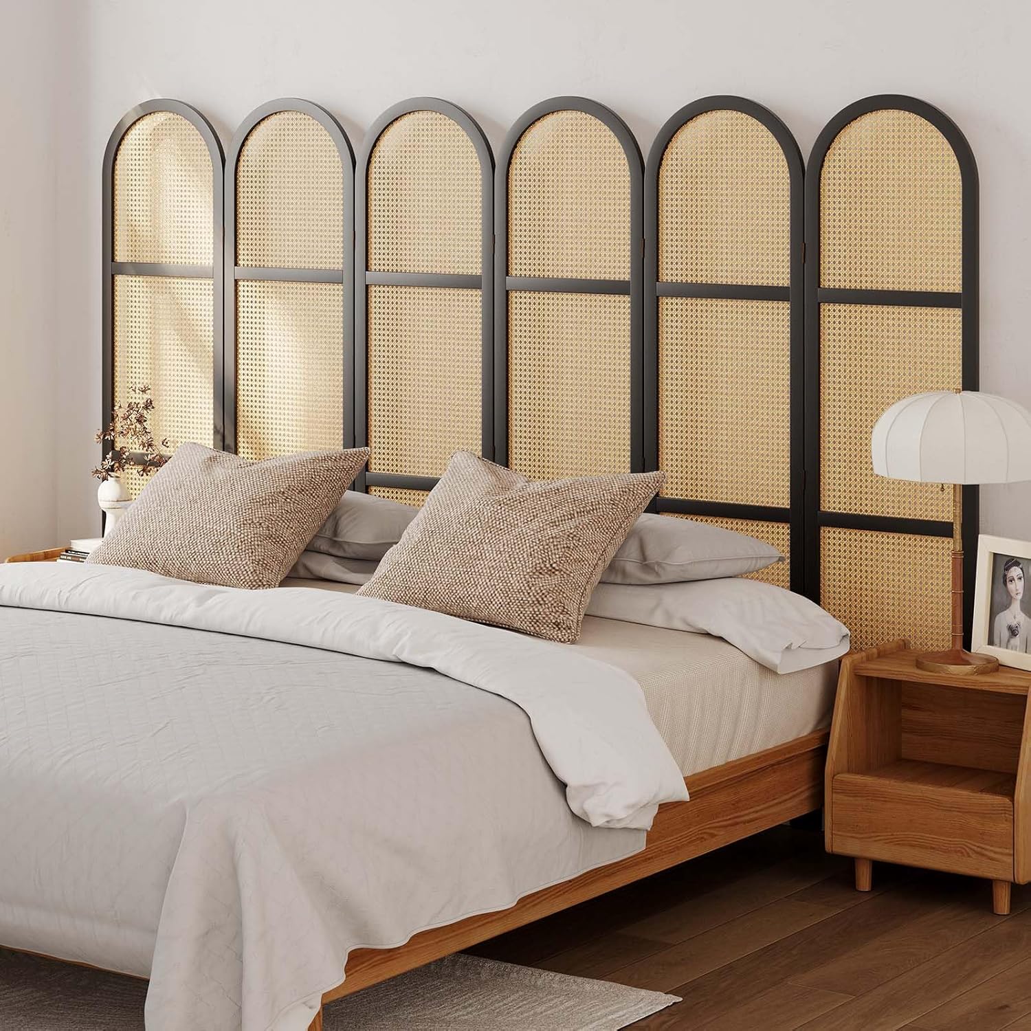 - High-Quality Material: The frame is crafted from pine wood rather than the common paulownia wood found in the market. Pine is typically more durable, has a higher density, and is less likely to suffer damage and wear. Additionally, pine usually features a more appealing grain pattern, enhancing the aesthetic appeal. The minimalist style of pine wood and rattan, along with the perfect color combination, brings more warmth and naturalness to your room