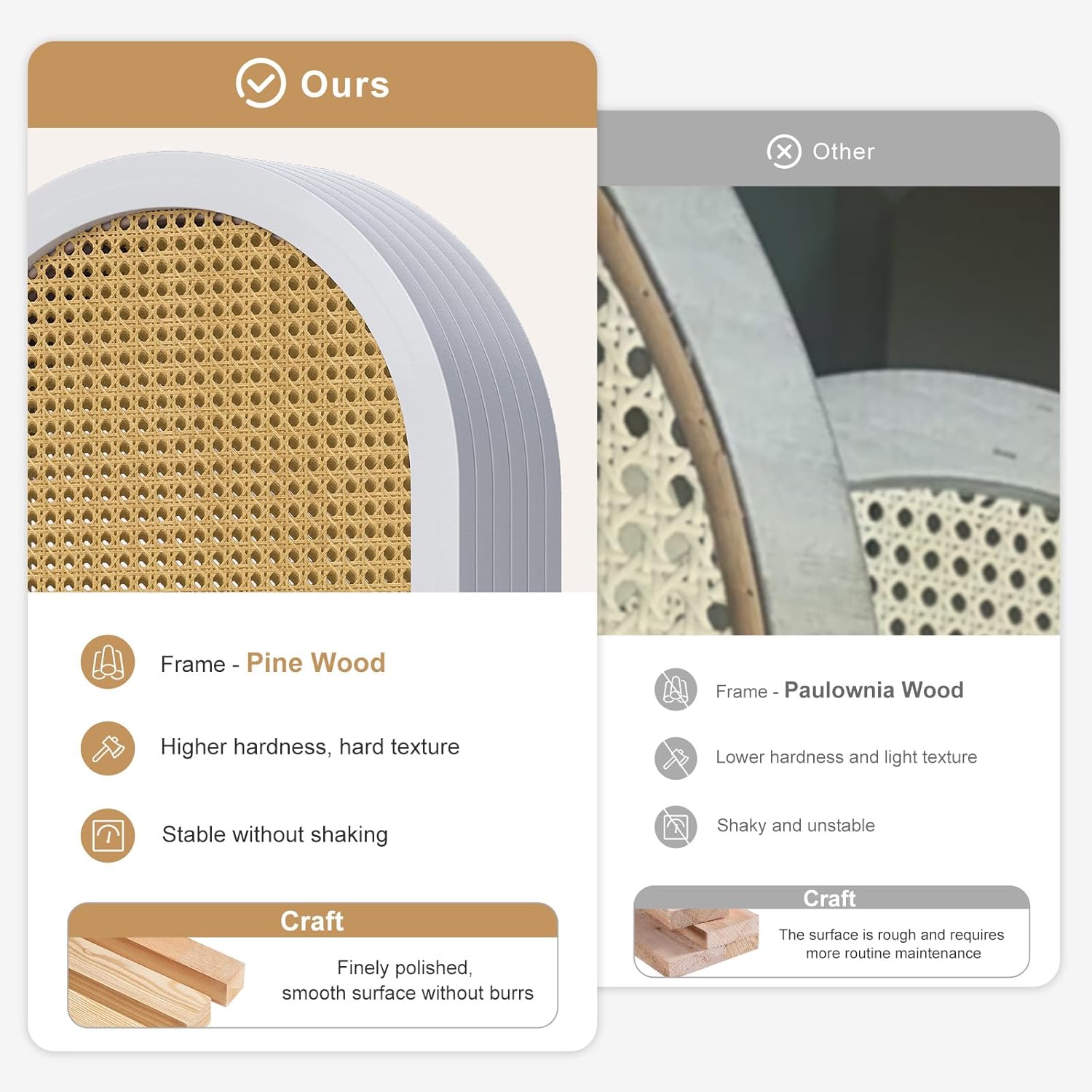 - High-Quality Material: The frame is crafted from pine wood rather than the common paulownia wood found in the market. Pine is typically more durable, has a higher density, and is less likely to suffer damage and wear. Additionally, pine usually features a more appealing grain pattern, enhancing the aesthetic appeal. The minimalist style of pine wood and rattan, along with the perfect color combination, brings more warmth and naturalness to your room