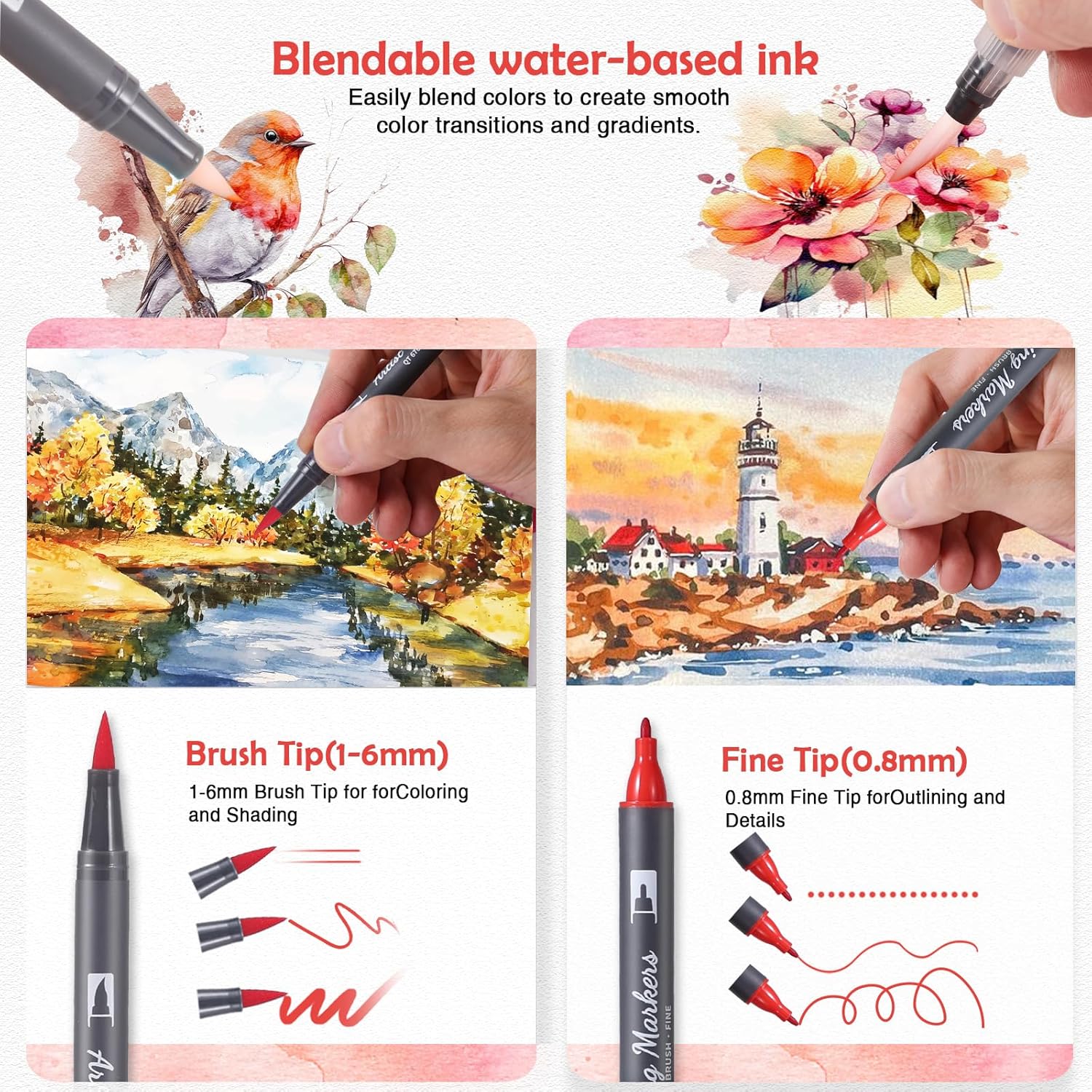 - [ Brush & Fine Dual Tip Art Markers ] - Each brush tip marker features a double-ended design for ultimate versatility. The fine 0.8mm tip is perfect for detailed artistry, while the adjustable brush pen tip (1 to 6mm) excels at bold strokes and calligraphy. Use the fine tip for precision and sweeping calligraphic strokes, or the broad brush tip for quickly coloring large areas.