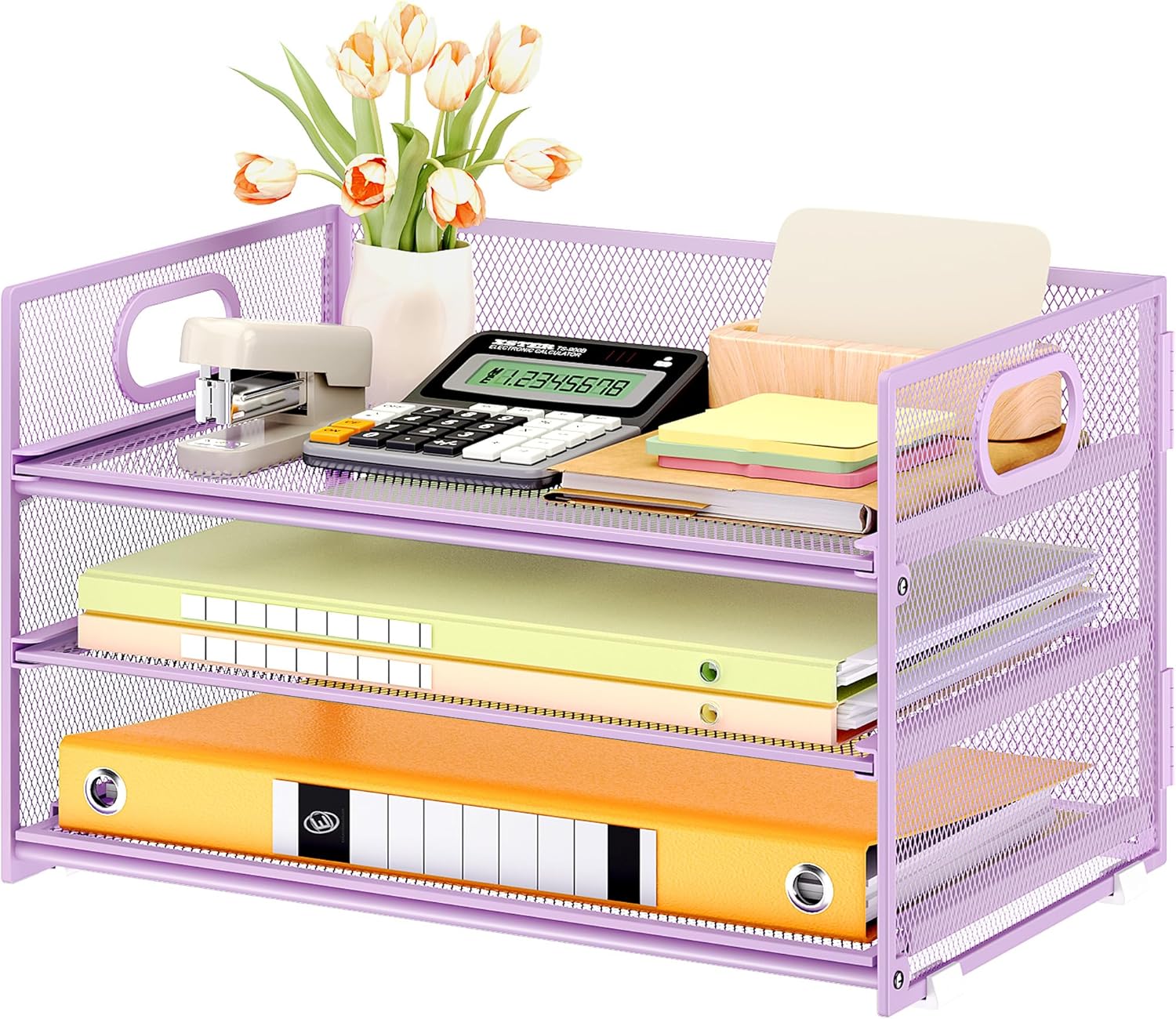 Subekyu 3 Tier Letter Tray Paper Organizer with Handle and 1 PC Sliding Tray, Purple Metal Mesh Desk File Folder Paper Sorter Organizer for Home Office School Desk Supplies Organization Storage