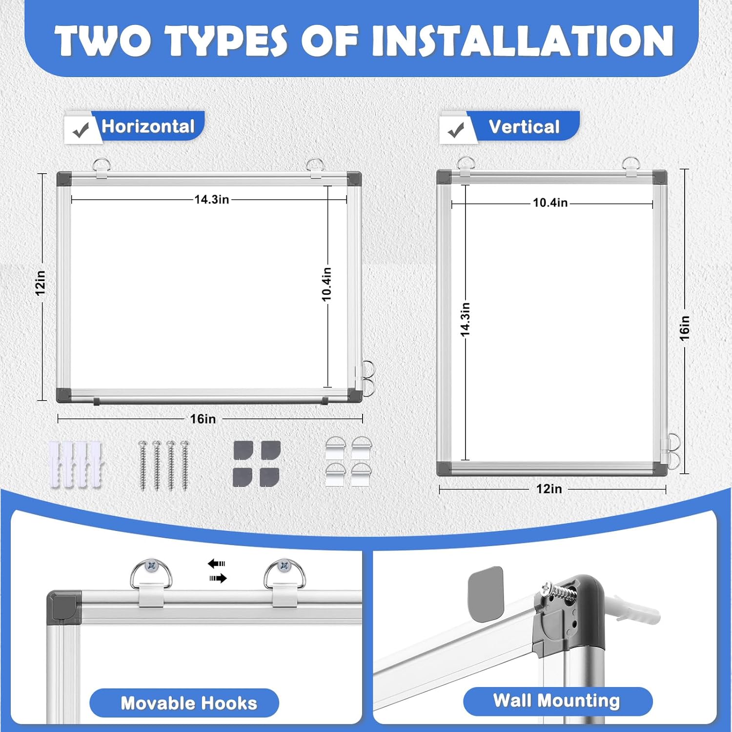 WALGLASS Double-Sided White Board, 16" x 12" Small Dry Erase Board Magnetic Whiteboard for Wall, Hanging Mounted Whiteboard Silver Aluminium Frame for Home, School, Office, Kitchen