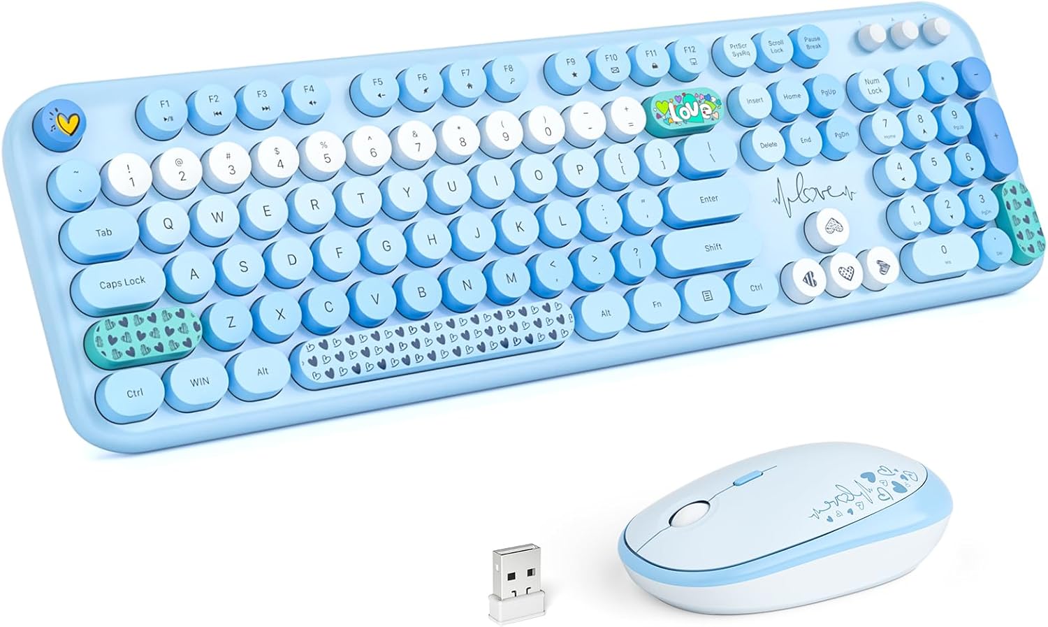 Wireless Keyboard and Mouse Combo, MOWUX Full Size Typewriter Retro Round Computer Keyboard, Cute Optical Mouse Wireless, Plug and Play, for Laptop, PC, Computer - Blue Heart