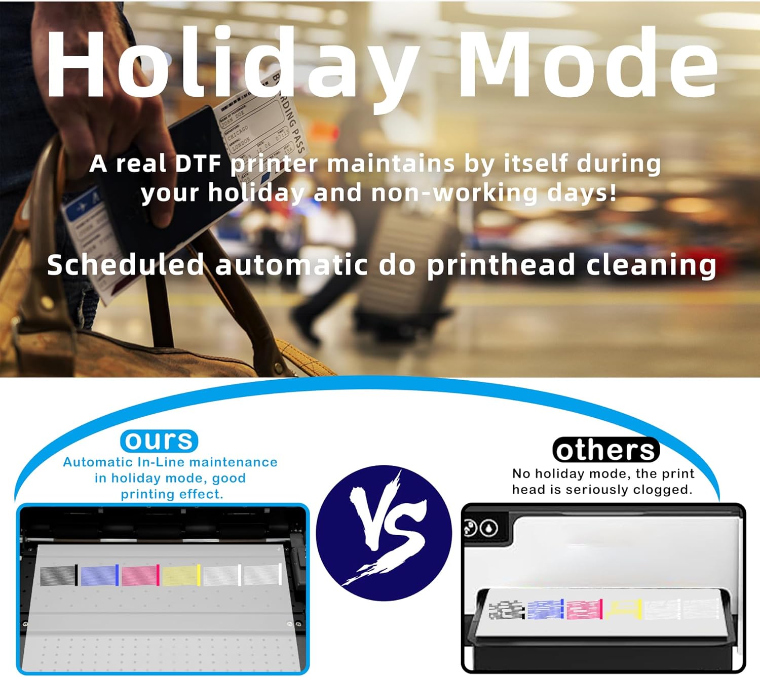 - ✅【Smart Holiday Mode】: The M1630 Pro DTF printer automatically maintains printhead health during extended periods of non-use, such as holidays or business trips. This feature ensures that you won't have to worry about clogged printheads or ink tubes when you return.