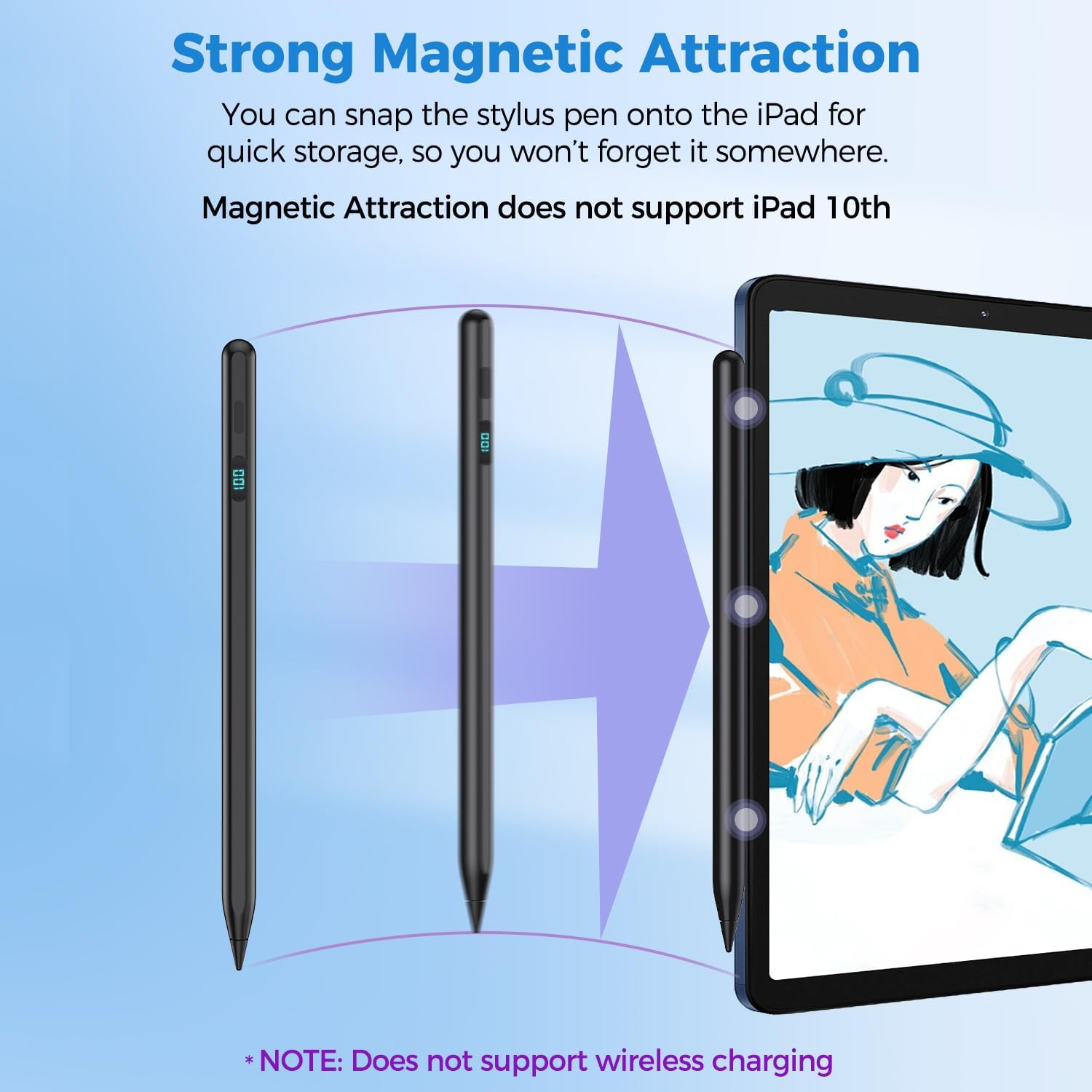 - 【Strong Magnetic Attraction】You can snap the digital pen onto the iPad for quick storage, so you won’t forget it somewhere.*NOTE: The stylus pen does not support wireless charging on iPad.