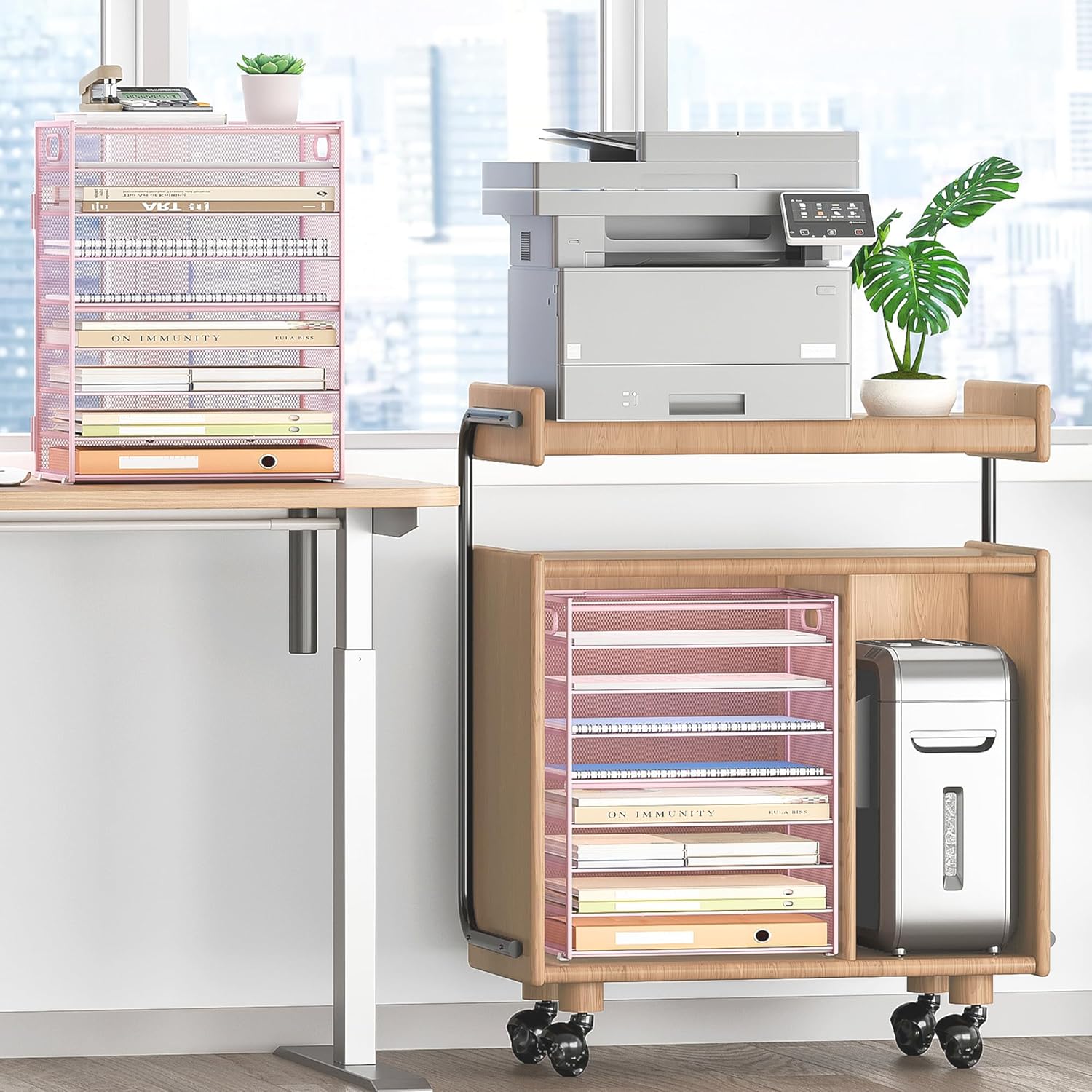 Subekyu 9 Tier Paper Letter File Tray Organizer for Desk, Pink Large Mesh Desk Folder Sorter Organizer with Handle, Include 6 Pcs Adjustable Height Slid Tray for Office Home School Supplies Storage
