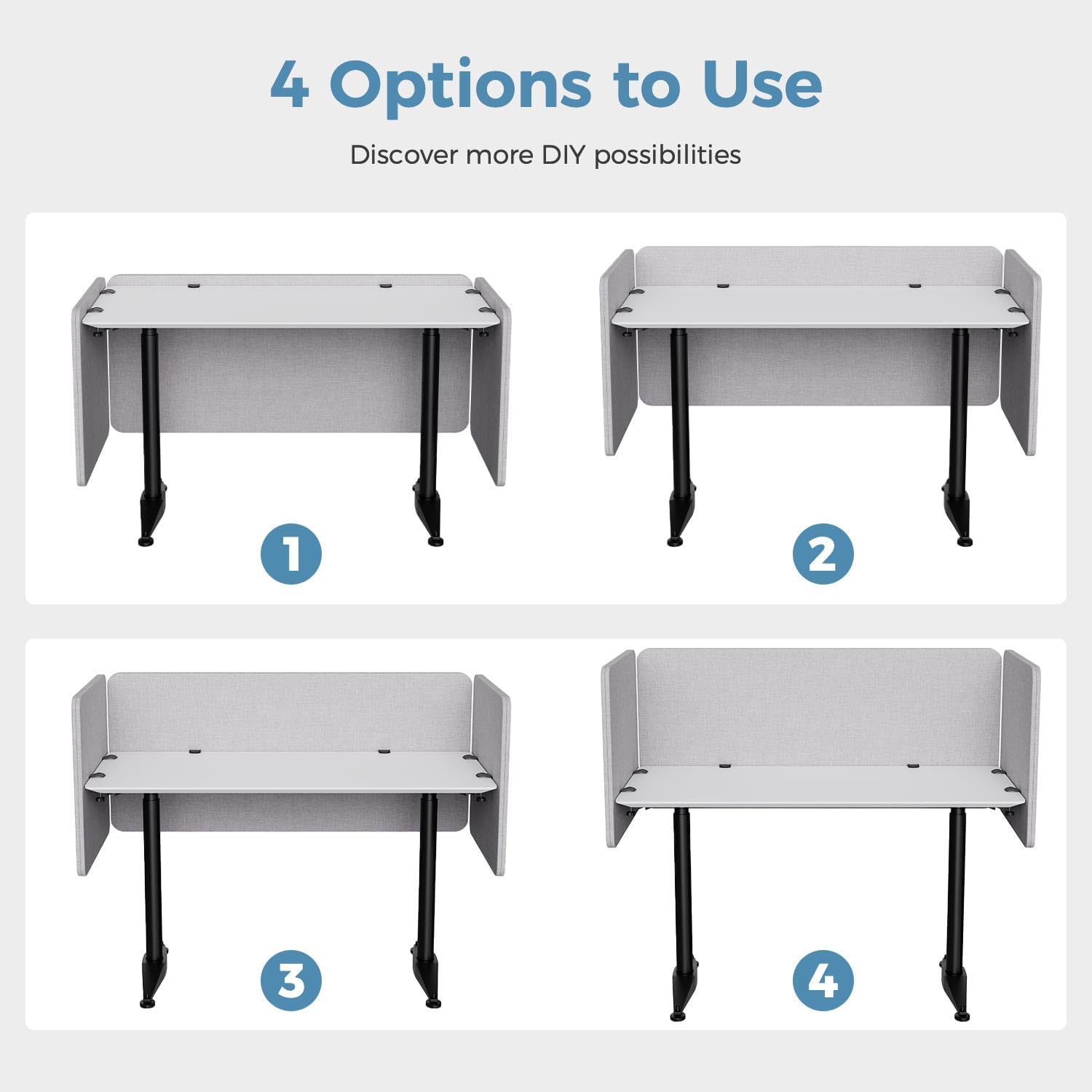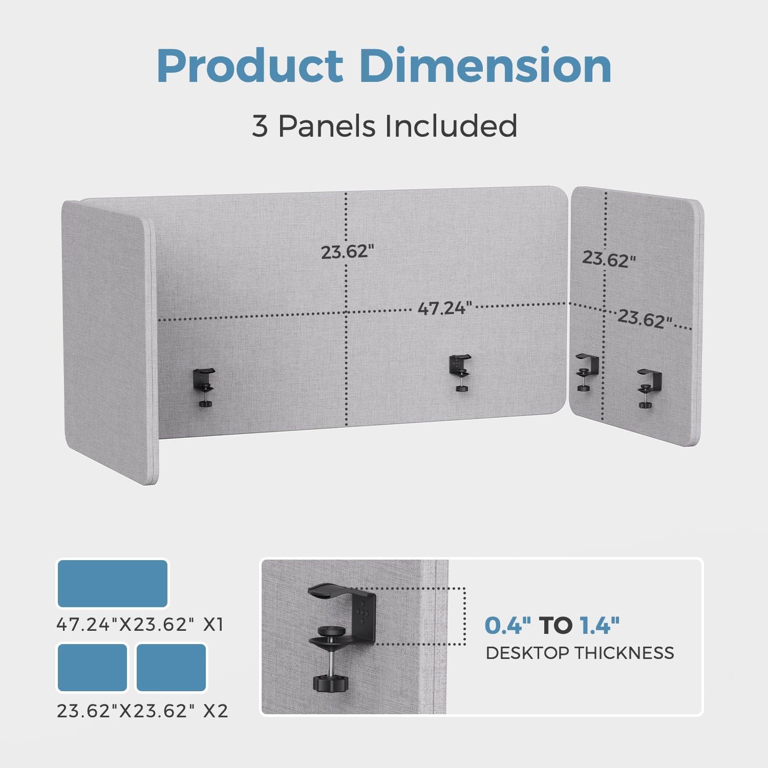 - Complete Desk Privacy Set: Designed to create a sense of privacy in open environments, this desk privacy set includes one 47.2” x 23.6” panel and two 23.6” x 23.6” panels, designed to cover three sides of your desk. The sound-reducing material relieves you from loud noises and increases your privacy. Panels can be mounted above or below the desk.